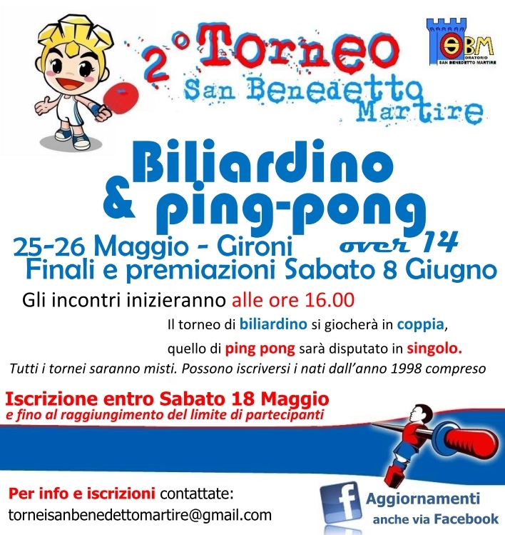 SAN BENEDETTO DEL TRONTO – L’Oratorio di San Benedetto Martire si prepara ad ospitare la seconda edizione dei tornei di ping pong e biliardino, con una formula più concentrata della precedente che prevede lo svolgimento degli incontri dei gironi nei pomeriggi del 25 e 26 Maggio. Finali e premiazioni avranno luogo Sabato 8 Giugno.
