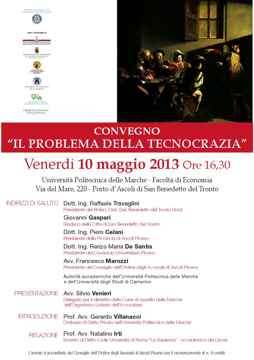 Dopo i saluti del presidente del Rotary Club San Benedetto del Tronto Nord Raffaele Travaglini, del sindaco di San Benedetto Giovanni Gaspari, del Presidente della Provincia di Ascoli Piceno Piero Celani, del Presidente del Consorzio Universitario Piceno Renzo Maria De Santis, del Presidente dell’Ordine degli avvocati di Ascoli Piceno Francesco Marozzi, del Preside della Facoltà di Giurisprudenza dell’Università degli Studi di Camerino Antonio Flamini e del Direttore del Dipartimento Management e Organizzazione Industriale dell’Università Politecnica delle Marche Stefano Marasca, verrà svolta un’introduzione all’argomento da parte del Prof. Avv. Gerardo Villanacci, Ordinario di Diritto Privato nell’Università Politecnica delle Marche. Coordinerà l’evento l’avvocato Silvio Venieri, delegato per il distretto della Corte di Appello delle Marche dell’Organismo Unitario dell’Avvocatura Italiana.