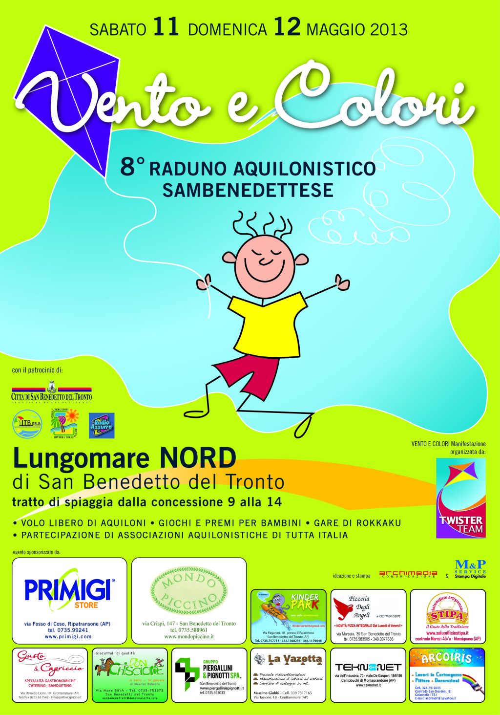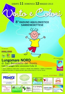 SAN BENEDETTO DEL TRONTO– Sabato 11 e domenica 12 maggio, presso la spiaggia delle Concessioni balneari 9-10-11-12-13-14-14bis , si terrà l’annuale raduno aquilonistico “Vento e Colori” organizzato dall’associazione Twister Team.
