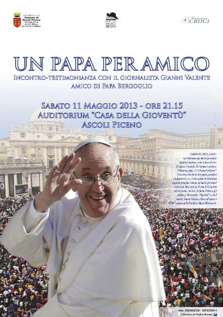 L’iniziativa, patrocinata dalla Provincia e dal Comune di Ascoli ed organizzata dall’associazione culturale “Il Portico di Padre Brown”, rappresenta quindi un’occasione qualificata per conoscere meglio, attraverso l’intervento di un protagonista della stampa nazionale, il pensiero e il lato umano del nuovo Pontefice già così apprezzato per la sua semplicità ed immediatezza.