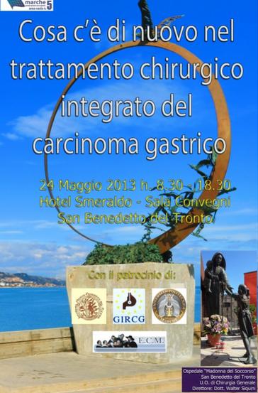Questo evento è patrocinato dall’Accademia Medico-Chirurgica del Piceno, dall’Università Politecnica delle Marche e dal GIRCG, Gruppo Italiano Ricerca sul Cancro Gastrico, che dal 19 al 23 Giugno di quest’anno organizza a Verona il Congresso Mondiale sul carcinoma gastrico e sarà presente a San Benedetto con molti dei suoi più autorevoli rappresentanti.