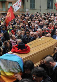 Il lungo corteo. La lunga mattinata per i saluti ufficiali era iniziata alle 10 con la partenza del feretro di don Andrea Gallo dalla chiesa di San Benedetto al Porto. Al corteo diverse migliaia di persone – forse 6mila – che si sono messe in cammino lungo le strade di Genova sotto una pioggia battente. Tra loro i ragazzi della Comunità di San Benedetto, fondata proprio da don Gallo, “gli ultimi” i prediletti dal “prete di strada”. Accanto a loro, amici e gente comune che camminava a fianco di personalità del mondo dello spettacolo, del calcio e della politica. Tante anche le bandiere. Unica nota stonata i fischi e le contestazioni indirizzati al cardinale Angelo Bagnasco al momento dell’omelia iniziati fuori dalla chiesa ma ben presto seguiti anche da numerosi dei presenti in chiesa tanto che il porporato ha dovuto interrompere l’omelia per poi terminarla frettolosamente dopo che una delle collaboratrici di don Gallo e segretaria della Comunità di San Benedetto, Lilli, è riuscita a riportare la calma. “Ragazzi! Ragazzi!” ha detto prendendo il posto del cardinale al microfono: “Voi così non rispettate la memoria e l’insegnamento del Gallo. Lui credeva nella Chiesa, ne aveva un rispetto profondo, ed era convinto che per vivere la Chiesa ha bisogno della testa e del cuore. Lui aveva un profondo rispetto per il suo vescovo. Impariamo ad ascoltare tutte le voci come lui ha ascoltato noi”.