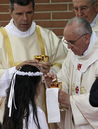 Al termine della messa il parroco ha annunciato un regalo dei bambini della prima comunione per il Papa: cantargli la benedizione di frate Francesco per invocare la benedizione di Dio su di lui. Il Santo Padre si è subito lasciato circondare dai bambini, chinando il capo, come la sera del 13 marzo, quando, appena eletto Pontefice, chiese ai fedeli riuniti a piazza San Pietro di invocare la benedizione di Dio su di lui. Poi il Papa, raggiante, ha spiegato ai bambini il senso della benedizione: ciascun cristiano può benedire, cioè dire bene dell’altro.