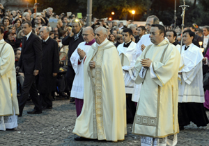 E mentre il buio avanza, le tante lucine della moltitudine dei fedeli che non solo hanno partecipato alla processione, ma che hanno aspettato lungo le vie che passasse Gesù Sacramentato, illuminano la notte. Con il Papa, concentrato e in preghiera, con un semplice piviale, che ha voluto camminare con il suo popolo dietro al Signore, è facile pensare alle parole dette ai vescovi italiani, solo una settimana fa, per la Professio Fidei, nella basilica di San Pietro, al termine dell’Assemblea generale della Cei: di essere pastori, che devono saper camminare innanzi, in mezzo e dietro al gregge.