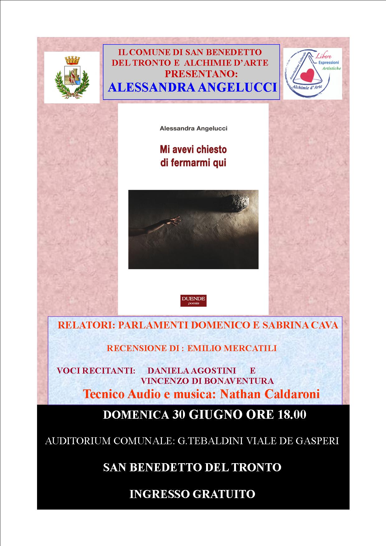 - Il 30 Giugno Auditorium Comunale G. Tebaldini di Viale de Gasperi ore 18.00 Alessandra Angelucci Conosciuta ai più come giornalista e manager culturale, Alessandra Angelucci è nata aGiulianova, dove attualmente vive. Figlia d’arte, è cresciuta fra i colori, le tele dipinte e l’inconfondibile profumo delle tempere vive. La stretta vicinanza al mondo artistico e ad ogni sua forma d’espressione la porta a laurearsi in Lettere presso l’Università degli Studi dell’Aquila e a specializzarsi in Management Culturale presso la LUISS di Roma. Grazie alla sua prima intervista a Dario Fo, realizzata per la stesura della sua tesi in drammaturgia, si accosta al mondo della carta stampata, diventando giornalista pubblicista. Per diversi anni scrive per riviste di settore («L’Urlo», «Forum Artis», «Tesori d’Abruzzo»), organizza e cura mostre d’arte in Italia e all’estero. Con due grandi voci recitanti: Vincenzo di Bonaventura e Daniela Agostini.
