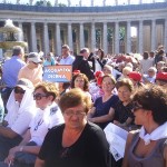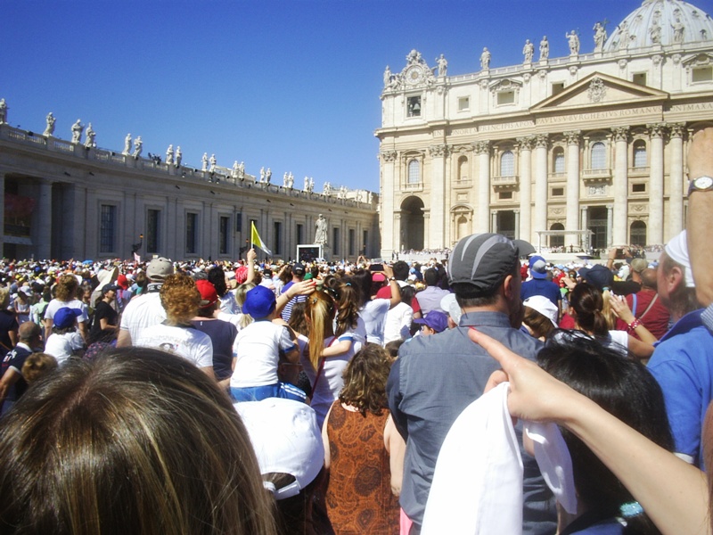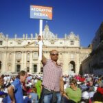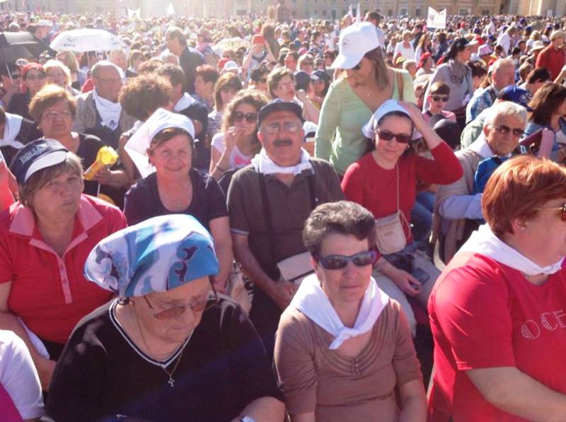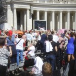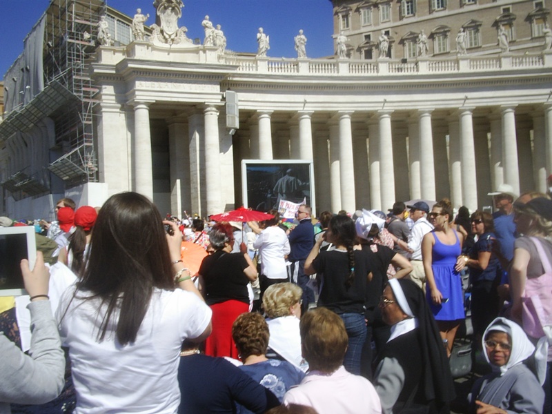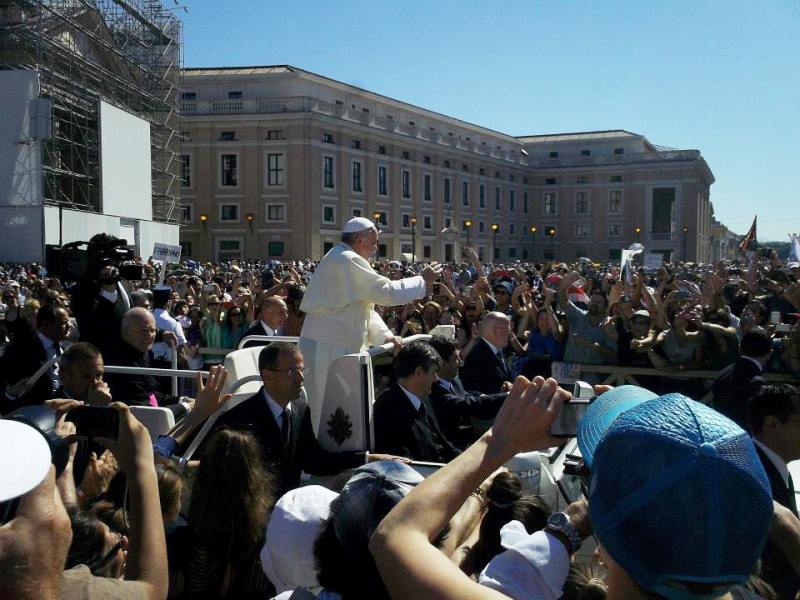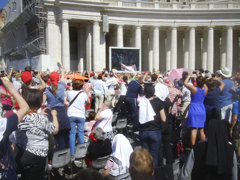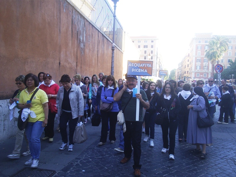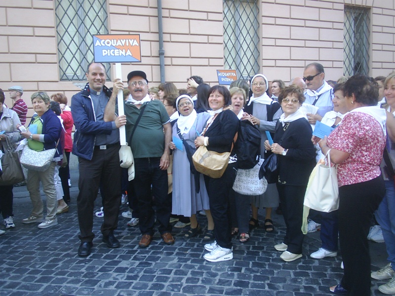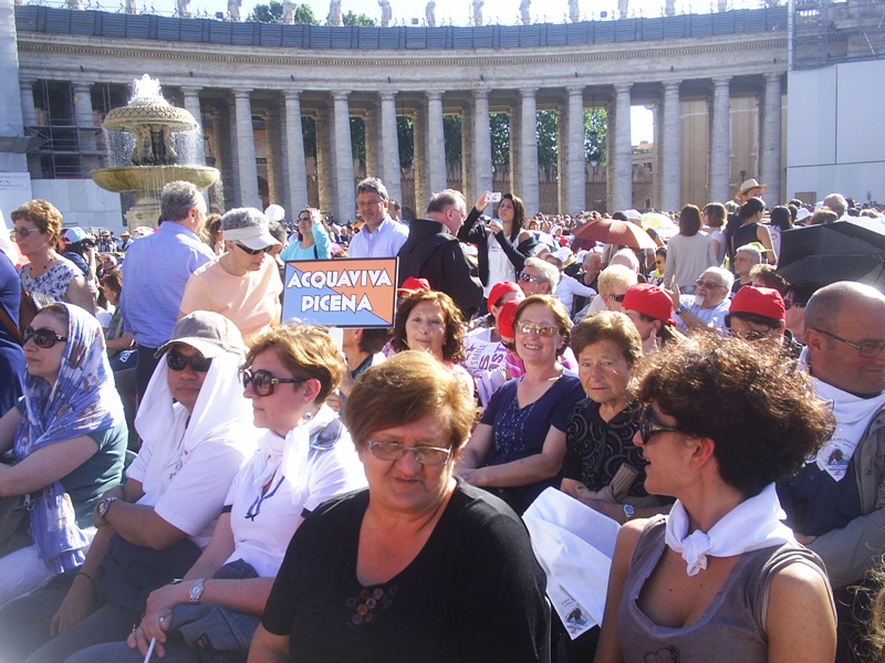 ACQUAVIVA PICENA – Mercoledì 12 giugno da Acquaviva sono partiti due autobus alla volta di Roma per partecipare all’udienza con il Papa. All’arrivo a Roma i fedeli sono stati accolti da una giornata di sole non troppo calda, almeno nelle prime ore, e intorno alle 8 hanno avuto modo di entrare in piazza San Pietro per prendere il posto migliore possibile. Per quasi tutti questa è stata la prima udienza con Papa Francesco e l’attesa è stata emozionante, ma è stato ancora più emozionante l’arrivo di Bergoglio: in quel momento buona parte delle persone presenti in Piazza San Pietro è salita sulle sedie, girandosi a 360 gradi per seguire il percorso di Bergoglio sulla jeep, per fare foto e riprese o commuoversi guardando le immagini sui maxischermi che riprendevano il Papa mentre abbracciava malati e bambini.