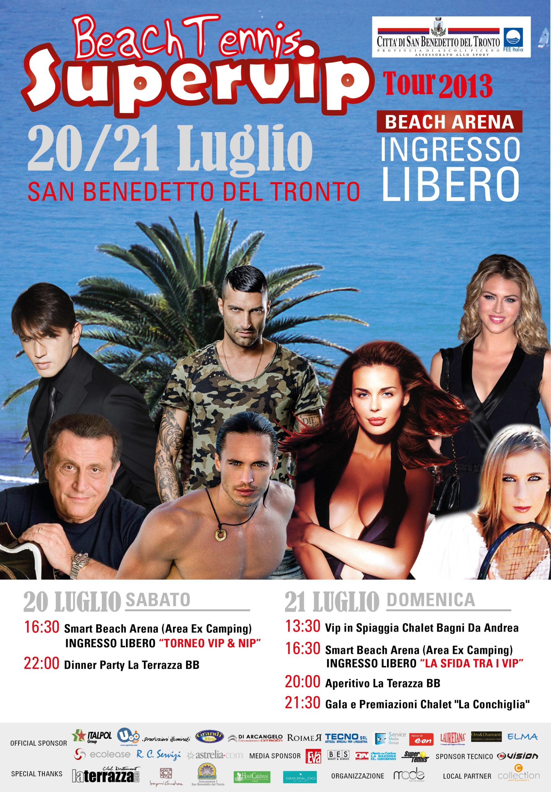 Infine, come ogni anno, quotidiani, settimanali e mensili sportivi e del gossip daranno un adeguato risalto alla manifestazione. Il Beach Tennis Supervip Tour è un evento ideato e organizzato dall’Agenzia Made Eventi di Ferrara che, per la tappa di San Benedetto del Tronto, si avvarrà del prezioso contributo organizzativo di Collection Eventi e Produzioni Tv. Dopo l’appuntamento di San Benedetto del Tronto (Ap), il tour farà tappa il 27 e 28 Luglio sulle spiagge del litorale emiliano romagnolo a Cesenatico, il 3-4 Agosto ai Lidi di Comacchio ed infine il 12-13 Agosto sull’Isola di Albarella, ospiti di Emma Marcegaglia nell’esclusivo resort del Gruppo Marcegaglia che ospiterà il master finale.