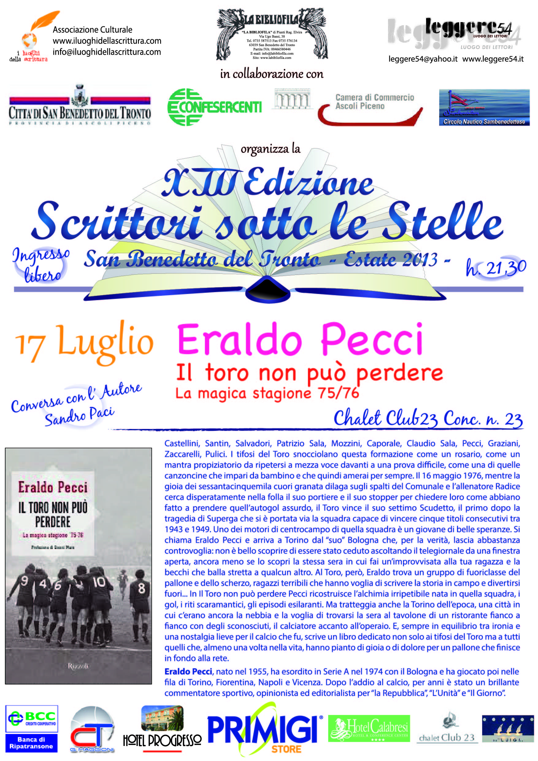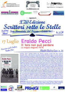 SAN BENEDETTO DEL TRONTO– L’ex giocatore Eraldo Pecci sarà a San Benedetto domani, mercoledì 17 luglio, allo chalet “Club23”per presentare il suo libro “Il Toro non può perdere”. L’evento inserito nella rassegna letteraria “Scrittori sotto le stelle”, patrocinata dall’Amministrazione comunale e organizzata dalla libreria “La Bibliofila”, avrà inizio alle 21,15. L’incontro è ad ingresso libero.