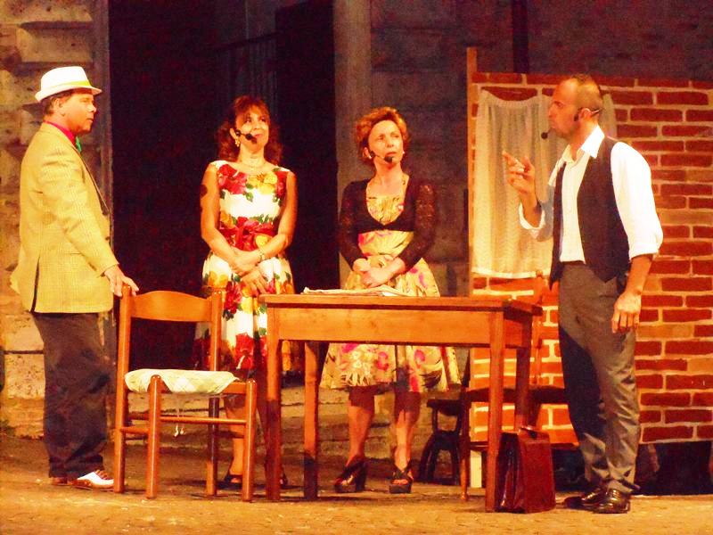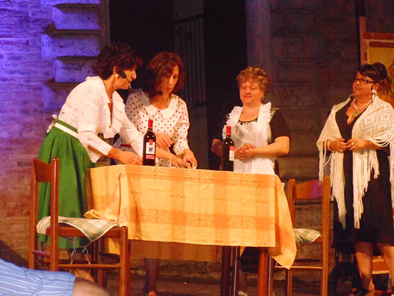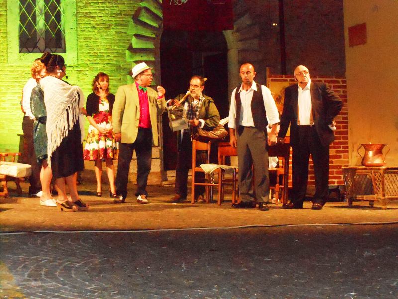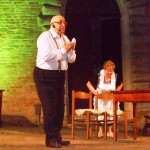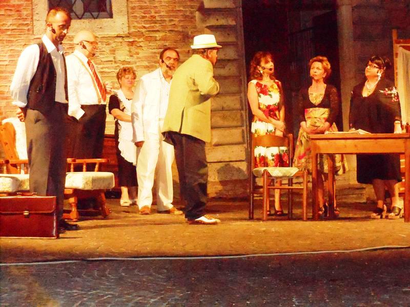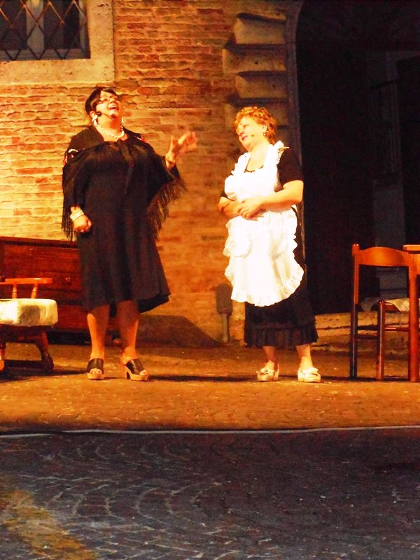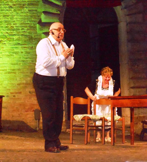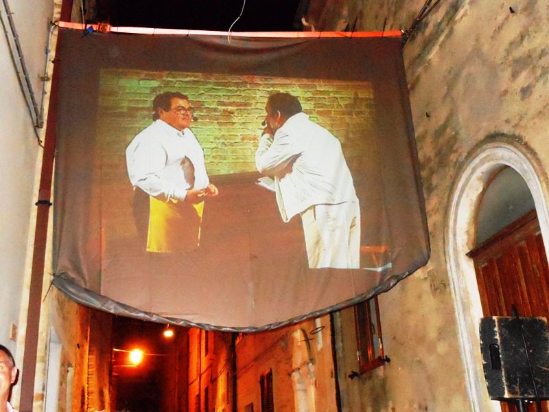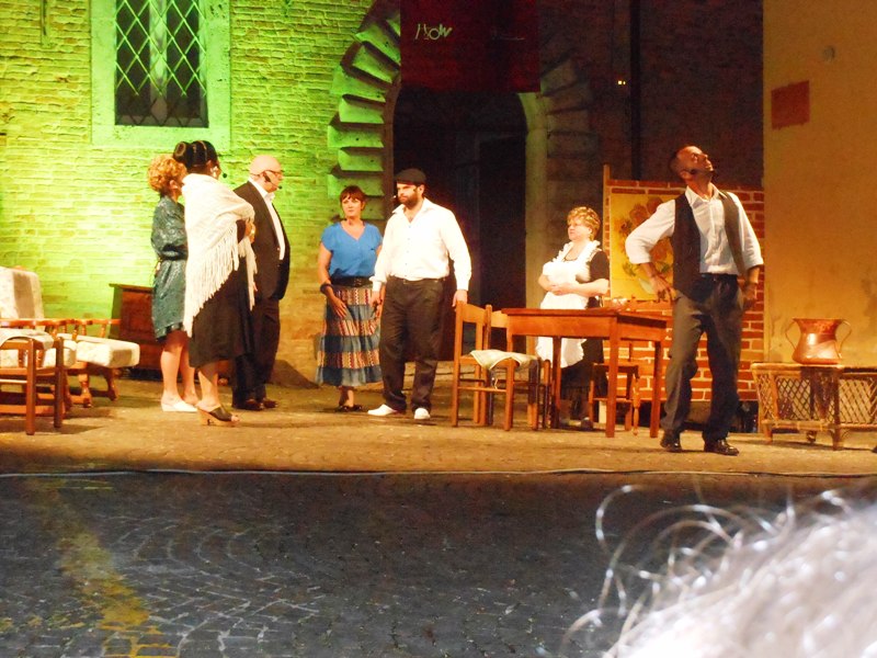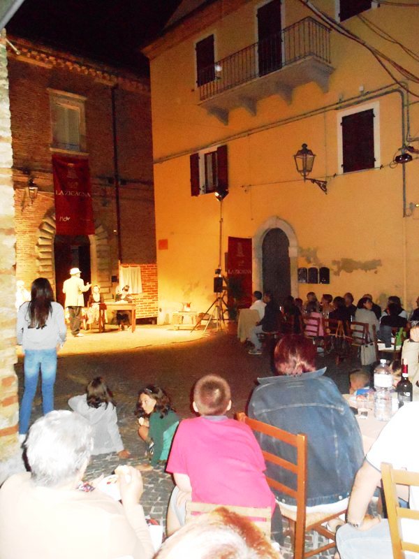 ACQUAVIVA PICENA – Nella serata di venerdì 19 luglio, nella piazzetta del borgo Colle di Acquaviva Picena, la compagnia La Zicagna ha dato prova di abilità e disinvoltura nella messa in scena della commedia di Eduardo Scarpetta dal titolo “Tre pecore viziose”, durante la cena organizzata dall’associazione Laboratorio Terraviva. Lo spettacolo è stato trasmesso in diretta nelle vie della zona del Colle lungo le quali i molti spettatori presenti erano seduti intorno ai tavoli per cenare insieme gustando piatti semplici della tradizione popolare.