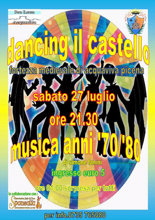ACQUAVIVA PICENA – Siamo arrivati alle soglie del secondo appuntamento della seconda edizione “ Dancing il Castello “ . Nella bellissima Fortezza di Acquaviva a cavallo tra gli anni ’70 e ’80 molti acquavivani e molte persone provenienti da paesi vicini come Colonnella, Martinsicuro, Rotella, Comunanza e Ascoli Piceno venivano per ballare al ritmo della musica dell’epoca che tutt’oggi rimane ancora una evergreen. La fortezza era conosciutissima per le sue serate danzanti, e sabato 27 luglio dalle ore 21:30 in poi, sarà possibile rivivere quell’atmosfera grazie all’impegno della Pro Loco che, con la collaborazione dell’associazione Palio del Duca, ci farà ballare al ritmo delle musiche rigorosamente targate anni ’70/’80 del dj Simone Fanini, vestiti come si usava in quei mitici anni, per chi vuole! Ingresso 5 euro, location incantevole, musica dal ritmo irresistibile: un’occasione da non perdere per una serata fantastica con sorpresa finale per tutti alle ore 01:00…chissà quale improvvisata avrà in serbo la Pro Loco per la conclusione della serata? Partecipare per vedere!