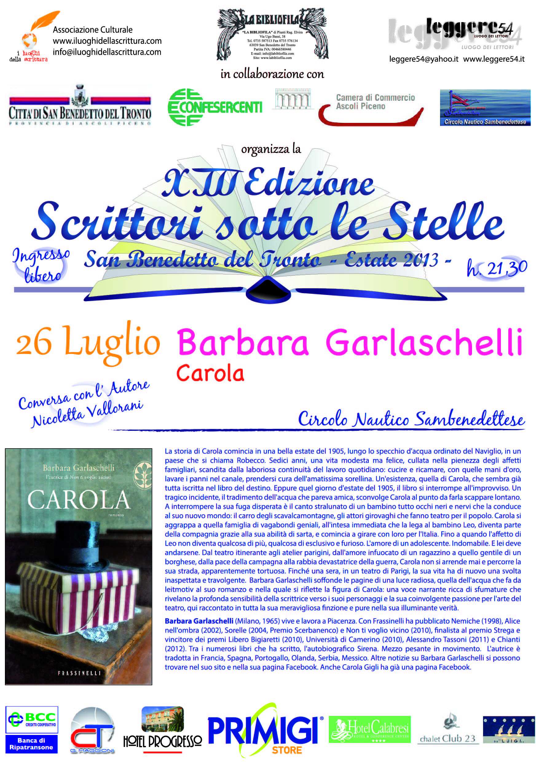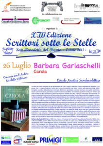 SAN BENEDETTO DEL TRONTO– Venerdì 26 luglio, alle 21,30, presso il Circolo Nautico Sambenedettese Barbara Garlaschelli presenterà il suo libro “Carola”. L’incontro, inserito nella rassegna letteraria “Scrittori sotto le stelle” organizzato dalla libreria “La Bibliofila” con il patrocino dell’Amministrazione comunale, sarà introdotto dalla scrittrice Nicoletta Vallorani.