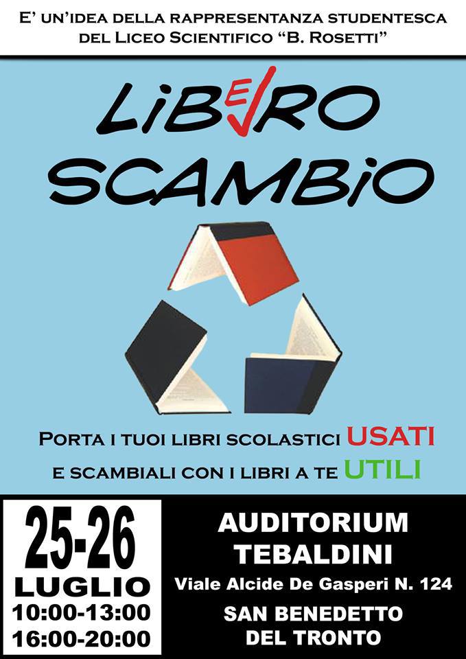SAN BENEDETTO DEL TRONTO– l “LIBeRO SCAMBIO” è un evento a partecipazione libera e gratuita che coinvolge tutti gli studenti delle scuole superiori del territorio piceno. E’ un’occasione in cui tutti i ragazzi potranno scambiarsi o vendere libri a prezzi vantaggiosi ( a partire dal 50 % in meno rispetto al prezzo originale).