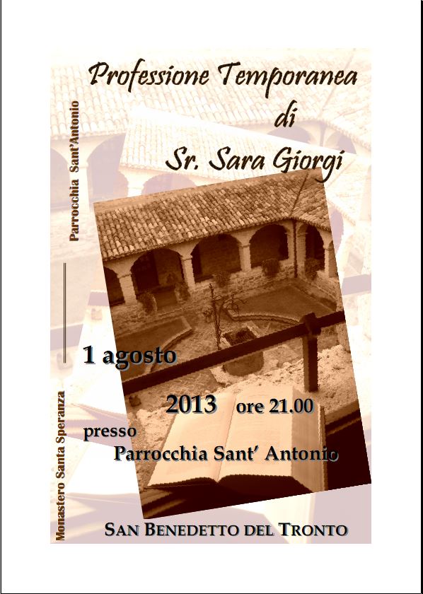 DIOCESI – Carissimi, vi invitiamo a prendere parte alla gioia della nostra comunità per la professione temporanea di sr. Sara Giorgi, giovedì 1 agosto alle ore 21.00 presso la Chiesa di Sant’Antonio a San Benedetto del Tronto. Vi aspettiamo per pregare e ringraziare insieme il Signore. Il Signore vi doni la sua pace!