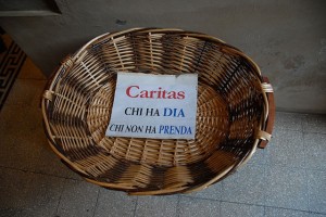 Ecco allora che l’iniziativa messa in campo dalla parrocchia di San Nicolò di Acquaviva Picena è di quelle che lasciano il segno. A qualunque ora del giorno si entri in chiesa, alla sinistra dell’ingresso, vi è un cesto di vimini con una scritta che recita: “Chi ha dia, chi non ha prenda”. Semplice, chiaro, inequivocabile. E nel cesto tutta una serie di banconote da 5 euro e di monete.