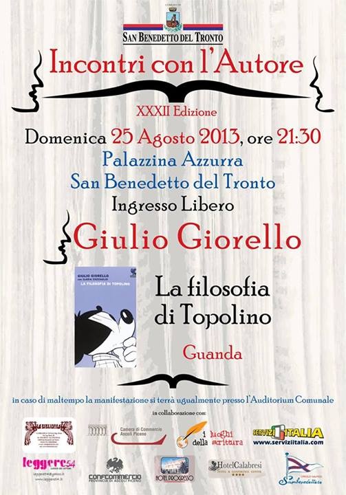 SAN BENEDETTO DEL TRONTO – Domenica 25 agosto alle ore 21.30 presso la Palazzina Azzurra (o in caso di pioggia presso l’Auditorium Comunale) Giulio Giorello presenterà il suo “La filosofia di topolino”. l’autore è ordinario di Filosofia della scienza all’Università degli Studi di Milano e collabora con il «Corriere della Sera». Tra i suoi numerosi saggi ricordiamo Prometeo, Ulisse e Gilgamesh (Raffaello Cortina, 2004) e Il tradimento (Longanesi, 2012)