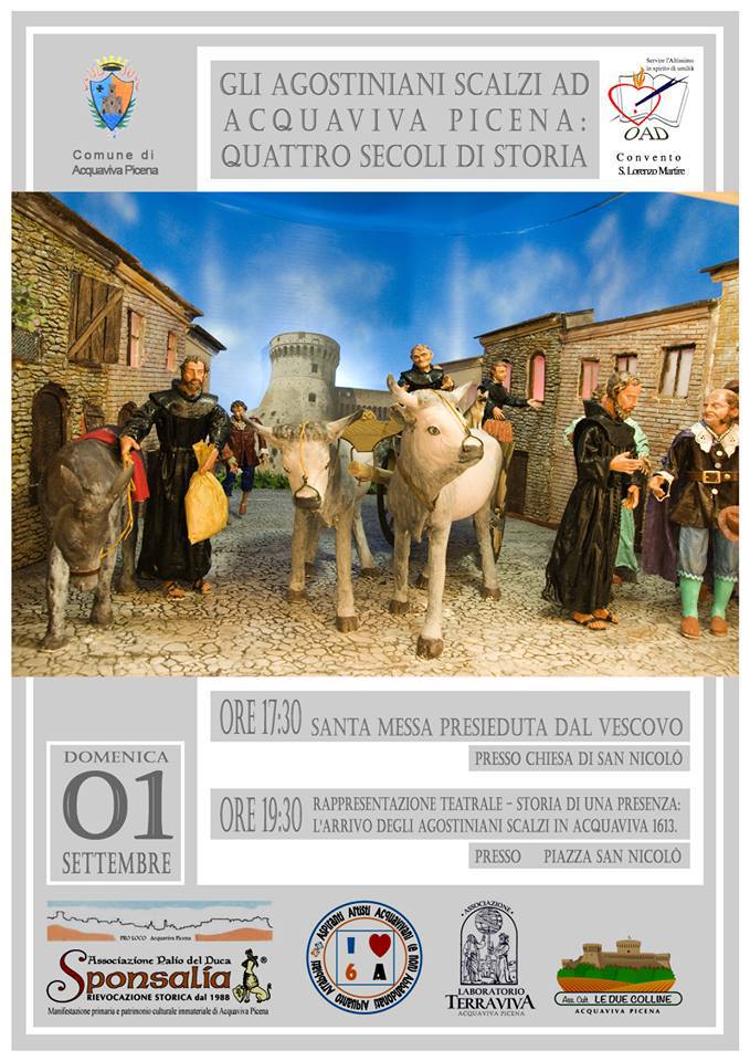 Alle 19:30 si terrà una rappresentazione teatrale dal titolo “Storia di una presenza, l’arrivo degli Agostiniani Scalzi in Acquaviva Picena”; questa rappresentazione, i cui dialoghi sono stati liberamente tratti da documenti storici tramandati sulla fondazione del convento nel 1613, nasce da una collaborazione tra varie associazioni acquavivane (A-6A, Terraviva, Sponsalia, ProLoco, Le due colline e GS sportiva), sotto il coordinamento del Comune. Gli attori saranno principalmente delle associazioni A-64 e Terraviva-Zicagna. Verranno utilizzati costumi appositamente realizzati o adattati, che richiamano la moda del 600, dei popolani e dei borghesi e ci sarà addirittura anche l’asino!