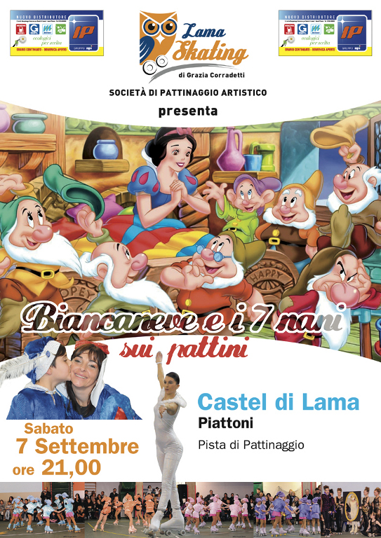CASTEL DI LAMA – Sabato 7 Settembre 2013 alle ore 21:00 presso la Pista di Pattinaggio Piattoni in Via Scodalupo a Castel di Lama, la Società di Pattinaggio Artistico Lama Skating presenta “Biancaneve e i sette nani sui pattini” con le coreografie curate dalle allenatrici Grazia Corradetti ed Annalisa Luciani.