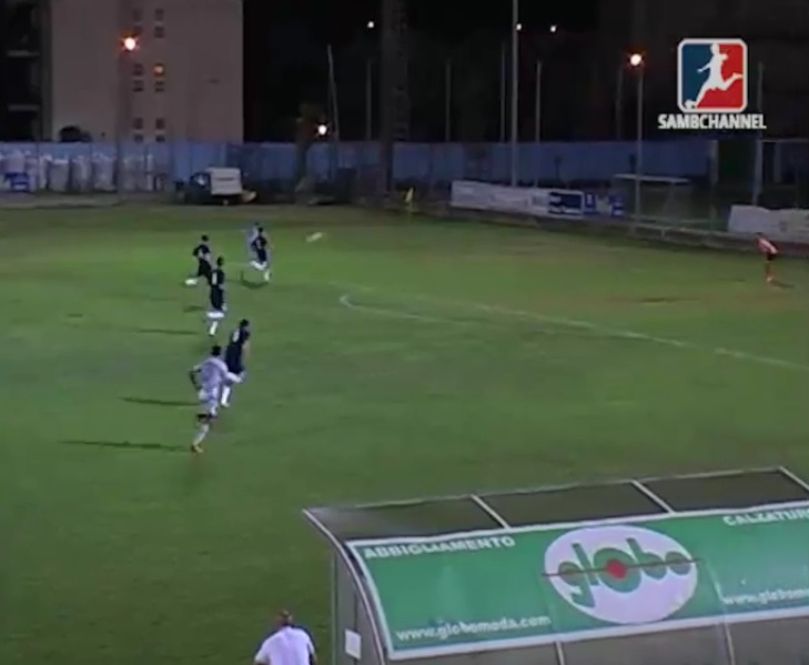 Cronaca: la Samb parte subito forte. Al 4′ punizione dalla trequarti battuta da De Rosa, pallone scodellato al centro dove Padovano stacca di testa ma il pallone colpisce il palo. Due minuti dopo i rossoblù sbloccano il risultato. Diti dalla destra lancia lungo a scavalcare la difesa, Varriale batte sullo scatto il diretto avversario e si invola da solo verso la porta avversaria, tiro al volo da fuori area e Ripa è battuto. I biancoblù faticano a reagire e al 19′ la Samb raddoppia. Ancora una volta punizione dalla trequarti di De Rosa che questa volta pesca Borghetti a centro area che di testa batte l’estremo difensore grottammarese. Trascorrono i minuti e gli uomini di Zaini provano ad alzare la testa ma si rendono pericolosi solo al 40′ quando Gibbs mette in mezzo per D’Ippolito che si gira bene e tira in porta, il pallone scavalca Zuccheri ma si spegne di un soffio a lato. Nel secondo tempo è di nuovo la Samb a prendere in mano il pallino del gioco e a rendersi pericolosa in più occasioni ma il terzo gol non arriva. Ci prova Padovani al 14′ ma perde l’attimo giusto e permette alla retroguardia biancoblù di rimediare. Al 23′ ci prova Galli ma spara alto. Al 26′ i rossoblù sono ancora una volta davanti a Ripa ma anche questa volta Padovani calcia fuori. La musica non cambia e al 28′ Traini pesca Tozzi Borsoi il cui tiro finisce sul palo. Il Grottammare tira i remi in barca e il finale è tutto per i rossoblù che controllano e attendono il triplice fischio di Catani di Fermo.