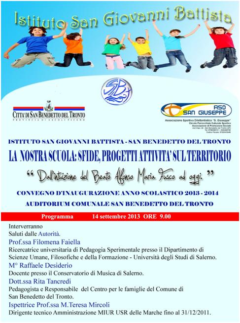 SAN BENEDETTO DEL TRONTO – L’Istituto scolastico “San Giovanni Battista”, arcinoto come la scuola delle “Battistine“, presente e attivo nella città rivierasca da 79 anni, in collaborazione con l’Amministrazione Comunale di San Benedetto del Tronto e l’associazione sportiva dilettantistica “San Giuseppe”, per il prossimo 14 settembre alle ore 9,00, presso l’Auditorium del Comune di San Benedetto del Tronto, agli addetti ai lavori e all’intera cittadinanza, presenta l’interessante convegno dal tema “ Dall’intuizione del Beato Alfonso Maria Fusco ad oggi, la nostra scuola: sfide progetti attività sul territorio”.