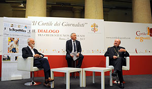Qualcuno li ha chiamati “il cardinale laico” e “il cardinale cattolico”. Il fondatore di un giornale che si dichiara non credente ma “innamorato” di Gesù, e rivela di aver appreso “forzatamente” dai gesuiti non la fede, ma l’arte di ragionare. Il presidente di un dicastero pontificio che loda pubblicamente il suo interlocutore, per aver dichiarato che è l’incarnazione, e dunque la Crocifissione di Cristo, l’elemento “capitale” del cristianesimo. Ma – aggiunge spiegando a un non credente il legame indissolubile, per il cristiano, tra Croce e Risurrezione – che “non c’è amore più grande di colui che dà la vita per la persona che ama”. È cominciato con un dialogo tra il cardinale Gianfranco Ravasi, presidente del Pontificio Consiglio della cultura, ed Eugenio Scalfari, fondatore de “La Repubblica”, il “Cortile dei Giornalisti”, la giornata del Cortile dei Gentili (www.cortiledeigentili.com) dedicata agli operatori della comunicazione. Nei due dibattiti successivi, i direttori dei principali quotidiani nazionali italiani si sono confrontati e interrogati su temi come il rapporto tra responsabilità e libertà, obiettività e verità nel mondo dei media – con i suoi “vizi” e le sue “virtù” – e le possibili interazioni tra fede e ragione. Il tutto a partire dalle straordinarie novità introdotte da Papa Francesco, nel modo di comunicare della Chiesa.