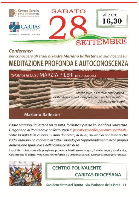 Il primo passo del metodo MPA è dedicato all’autoconoscenza: in un mondo che vive in superficie, Padre Mariano, invita ad entrare dentro di noi per conoscerci nel profondo e per purificarci; poi il viaggio continua, verso la meditazione che scende sempre più in profondità. Il gesuita Ballester ha scritto molti libri, in particolare quelli editi da Edizioni Messaggero Padova: “Iniziazione alla Preghiera Profonda”, ” Meditare un sogno”, Fratello segno, sorella vita”, “ Meditazione Profonda e Autoconoscenza”. La dott.ssa Pileri, grande conoscitrice del mondo Ballester, è guida al metodo MPA . Ci illustrerà in cosa consiste e, da psicoterapeuta, ci parlerà anche di un altro argomento che ci riguarda da vicino: quello dei sogni.