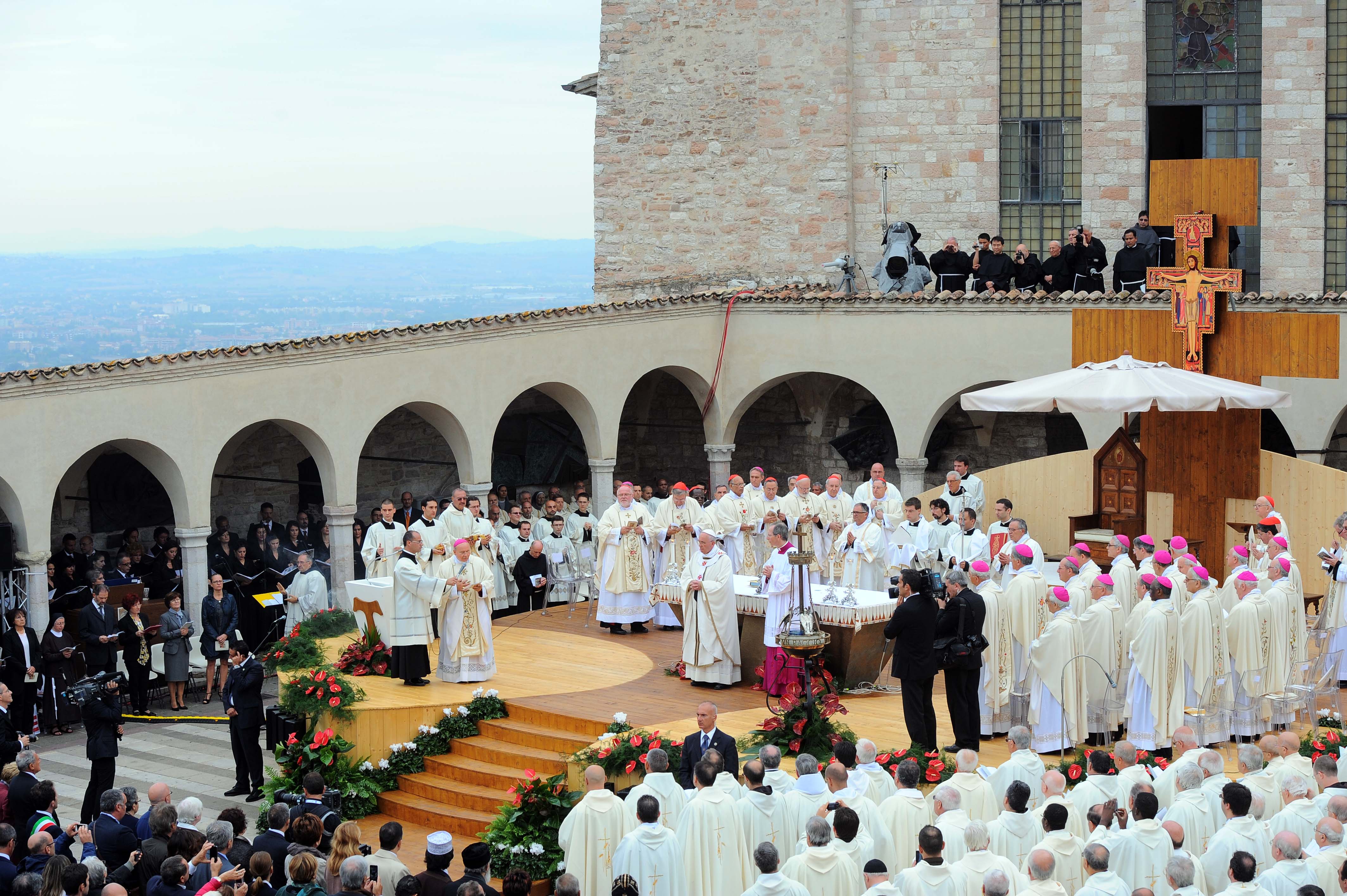Assisi-Roma, Roma-Assisi, andata e ritorno. Un Santo e un Papa, ad ottocento anni di distanza. San Francesco è andato a Roma per essere “confermato” dal successore di Pietro, e Papa Francesco – il primo successore di Pietro che ha scelto di chiamarsi come il “poverello” – viene ad Assisi per “confermare” nella fede la sua Chiesa. E lo fa con un gesto clamoroso, non però nel senso in cui lo interpretano i media, ma entrando – anche questa una prima volta di un Papa – nella Sala della Spoliazione, il luogo dove san Francesco ha abbandonato i beni terreni, per spiegare “di che cosa deve spogliarsi la Chiesa”. Non solo la Chiesa, ma tutti i cristiani, perché la Chiesa siamo tutti noi. Così – come aveva fatto nel suo primo discorso al Serafico – abbandona il testo scritto per parlare per circa dieci minuti a braccio. Parte da Francesco, e a Francesco si rivolgerà con una sorta di preghiera speciale nell’omelia della Messa: tre invocazioni, più il “rilancio” di una preghiera per Assisi, per l’Italia, per il mondo. Ripercorriamo alcune tappe del terzo viaggio del Papa in Italia, per la festa del suo Patrono: un itinerario di 30 chilometri, a piedi e in “papamobile”, per toccare 12 luoghi francescani, con momenti pubblici ed altri privati e molto intimi, come il pranzo con i poveri al Centro di accoglienza della Caritas, la sosta silenziosa in preghiera sulla tomba di san Francesco o a Santa Chiara “a tu per tu” con il Crocifisso di San Damiano. Nel tardo pomeriggio, il “bagno di folla” con i giovani, a S. Maria degli Angeli, preceduto dalla preghiera alla Porziuncola: quasi una “Gmg” umbra con 12mila ragazzi che quasi straripavano dalle transenne.
