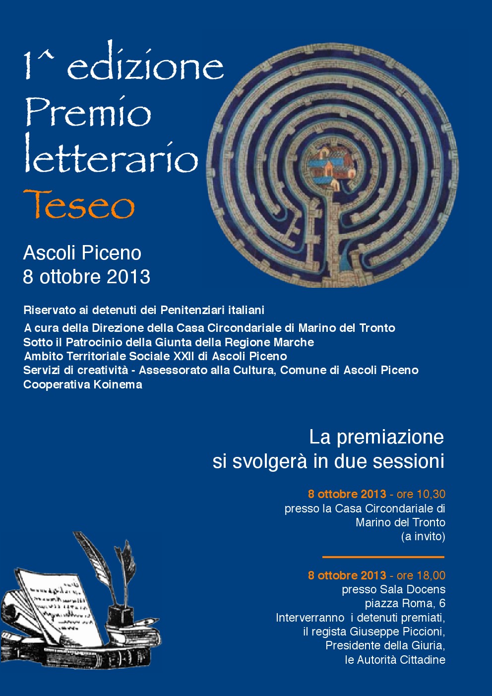 PROVINCIA – L’otto ottobre, alle ore 18, presso la Sala Docens di Ascoli Piceno, verranno premiati i vincitori del Premio letterario Teseo, indetto dalla Casa Circondariale di Marino del Tronto e riservato ai detenuti dei penitenziari italiani. Si tratta della prima edizione di un premio nazionale che ha visto una massiccia partecipazione da tutto il Paese. Alla selezione dei testi ha lavorato una Giuria formata dalla scrittrice Chiara Valerio, dal poeta Eugenio De Signoribus, dal regista Giuseppe Piccioni (Presidente) e affiancata da una commissione di studenti.