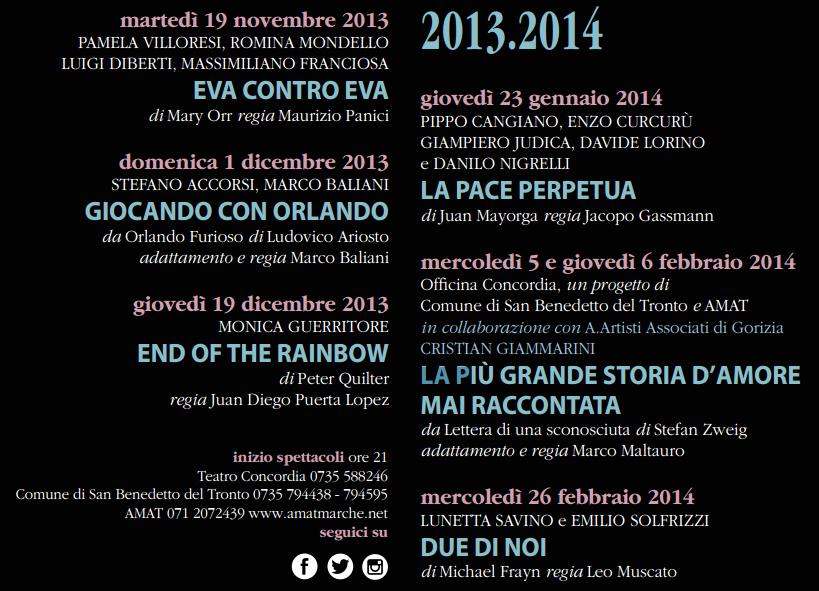 SAN BENEDETTO DEL TRONTO – Un cartellone teatrale con nomi celebri e titoli importanti è quello proposto quest’anno dal Teatro Concordia. Realizzato dall’assessorato alle politiche culturali del Comune di San Benedetto e dall’AMAT Associazione Marchigiana Attività Teatrali con il contributo del MiBACT Ministero dei beni e delle attività culturali e del turismo e della Regione Marche e il sostegno di BIM Tronto, Consorzio Bacino Imbrifero del Fiume Tronto.