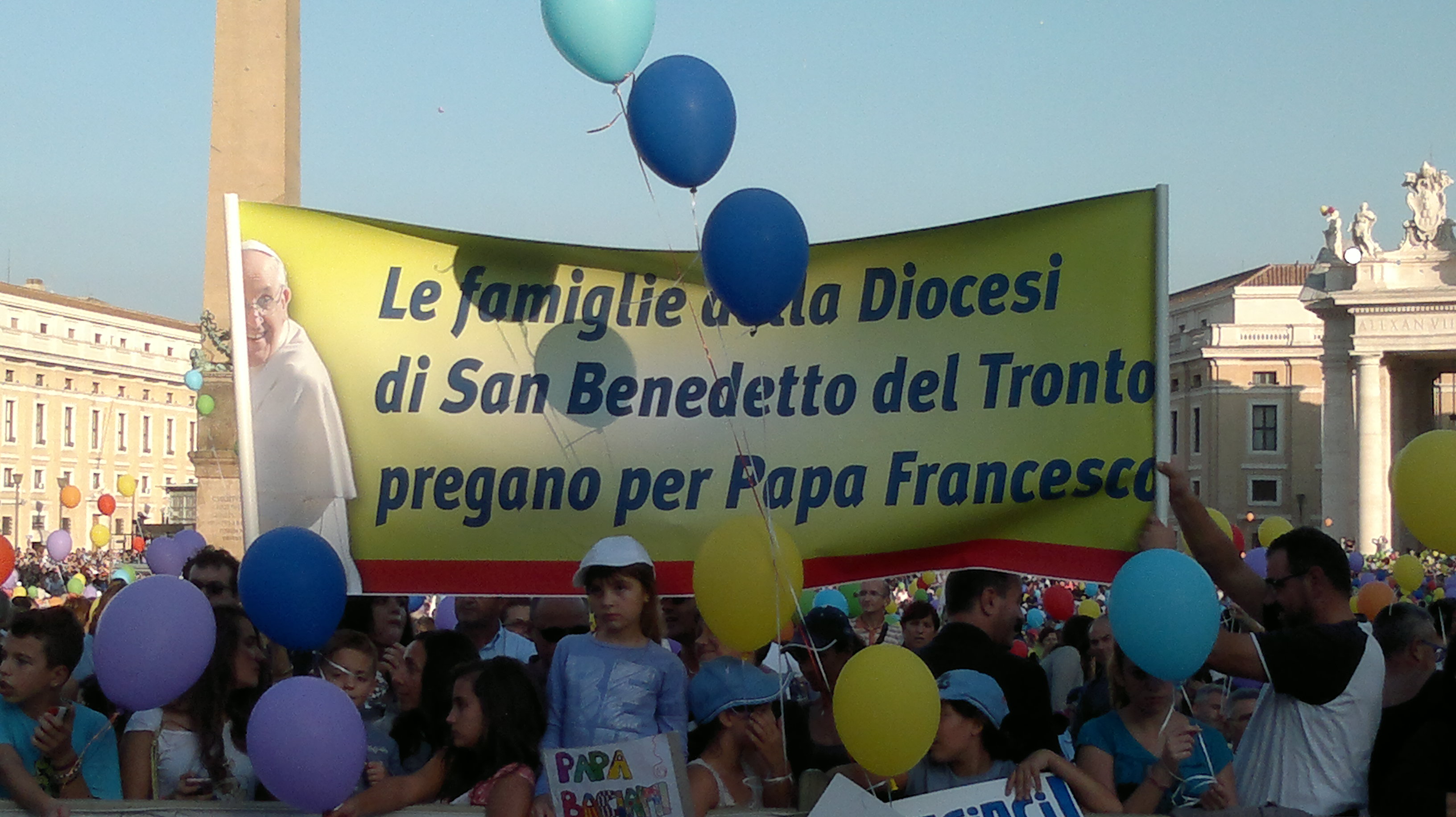 Siamo partiti con un grande entusiasmo e con una grande voglia di arrivare subito alla meta: piazza S. Pietro. Sui pullman, quando ci siamo avviati, abbiamo recitato la preghiera delle lodi, perché andare all’incontro con Papa Francesco non doveva farci dimenticare che, al di là di tutto, c’è l’incontro con Dio. Strada facendo, ci raccordavamo con gli altri pullman via cellulare. Siamo arrivati tutti tra le 10,30 e le 11,00 con i cartelli che portavano il nome della nostra diocesi e il numero dei pullman per ritrovarci. Avevamo anche uno striscione sul quale era scritto: “Le Famiglie della Diocesi di S. Benedetto del Tronto pregano per Papa Francesco”. Appena scesi abbiamo trovato qualche difficoltà: capire dov’eravamo tutti; comprendere da dove dovevamo entrare e per finire l’attesa, che per parecchi è stata sotto il sole fino alle 14,00; ma superata questa fase ed entrati in piazza s. Pietro, la gioia di esserci ha fatto dimenticare ogni difficoltà. Se ci guardavamo intorno vedevamo gli altri della diocesi: erano tutti dentro e con una sedia per godersi comodamente il pomeriggio. A noi come organizzatori, insieme a don Alfredo, questo bastava, perché sapevamo che il resto lo avrebbe fatto Dio. Così è stato. Tutto quello che è stato organizzato dal Pontificio Consiglio per la Famiglia, come i canti e le testimonianze, ha scaldato i cuori  in attesa dell’arrivo di Papa Francesco. Persino i bambini hanno meravigliato diversi adulti che hanno detto di non aver mai visto dei piccoli così buoni e tranquilli.