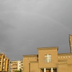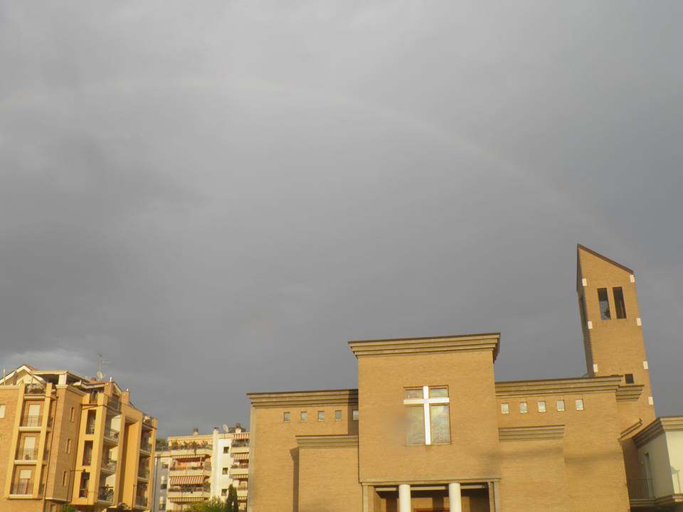 Fra sorrisi, foto ed abbracci, il tempo scorre piacevolmente ma arriva una nuvoletta dispettosa  che inizia a donarci un po’ della sua acqua, noi la ignoriamo e continuiamo a giocare, per un attimo il cielo grigio si colora di uno splendido arcobaleno che sembra abbracciarci,  ma lei non smette di mandar giù goccioline, quindi facciamo una sosta. Troviamo rifugio e riparo nella Sua Casa dove il plastico del parco si è arricchito di oggetti e personaggi che i bambini hanno “conquistato” giocando.