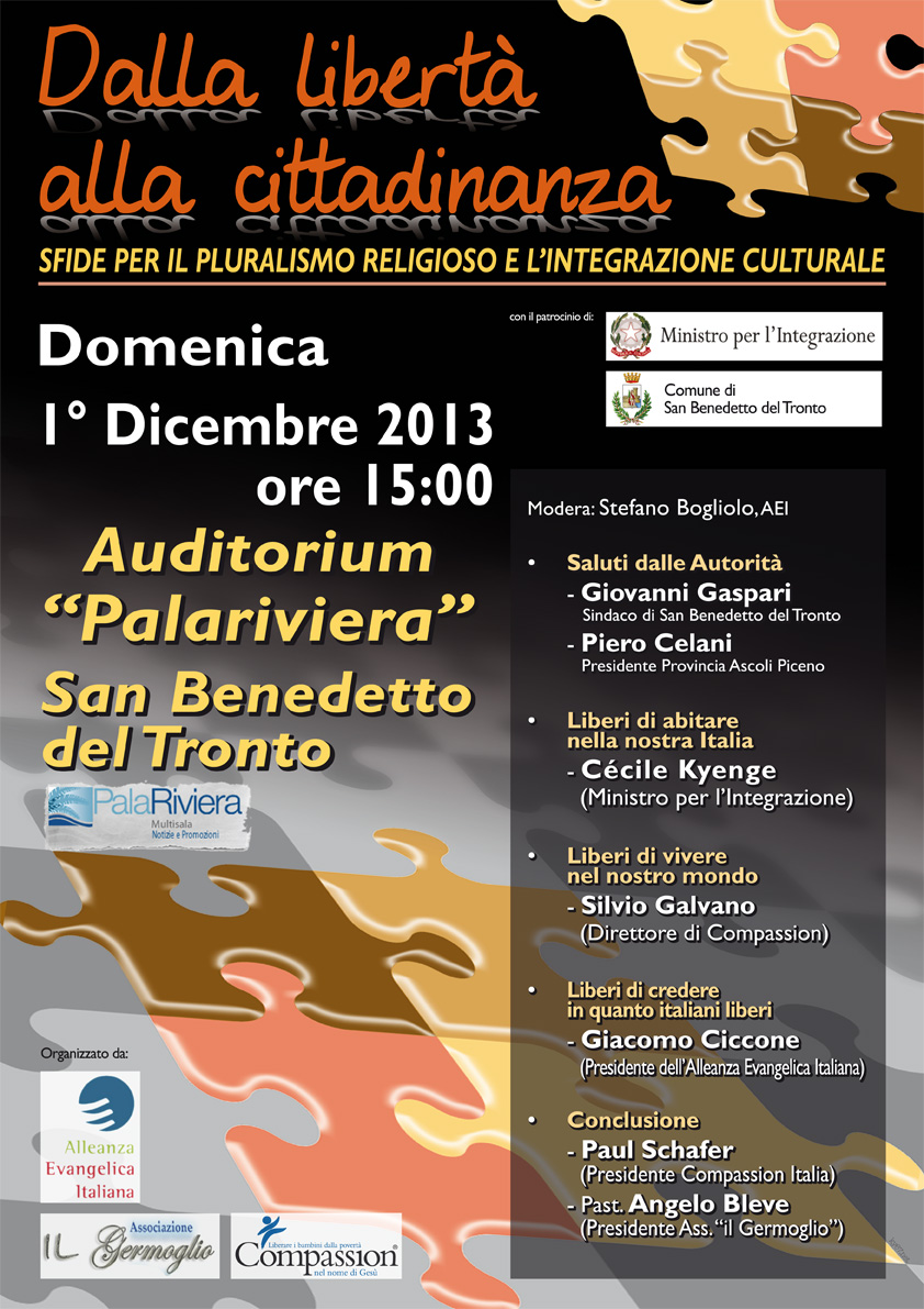 Si terrà a San Benedetto del Tronto domenica 1 Dicembre (ore 15, auditorium Palariviera, P.le Aldo Moro) la conferenza “Dalla libertà alla cittadinanza: sfide per il pluralismo religioso e l’integrazione culturale” nata per impulso dell’Alleanza EvangelicaItaliana che vedrà la speciale partecipazione del Ministro per l’Integrazione Cécile Kyenge.