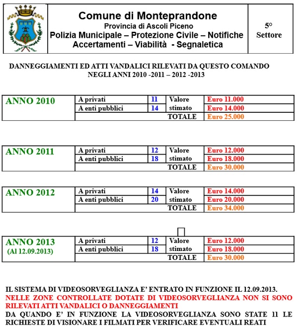 UN INVESTIMENTO PER LA SICUREZZA I dati rilevati dalla Polizia Municipale di Monteprandone diretta da Alfredo Scarfini infatti parlano chiaro: dal 2010 al 2013, gli atti vandalici e i danneggiamenti al patrimonio pubblico e privato sono costati una media di 30mila euro all’anno.