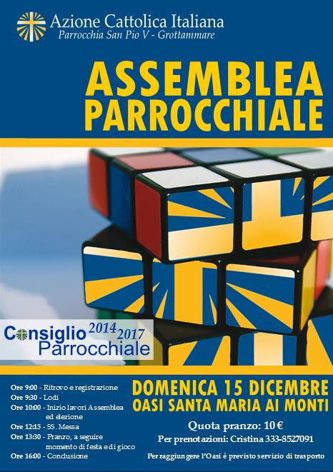 L’Azione Cattolica Italiana della Parrocchia di San Pio V invita tutti i soci e simpatizzanti a partecipare all’Assemblea Parrocchiale di AC, che si terrà domenica 15 dicembre presso l’Oasi Santa Maria ai Monti di Grottammare. Durante l’Assemblea si terranno anche le elezioni per il rinnovo delle cariche associative dei vari settori e articolazioni.