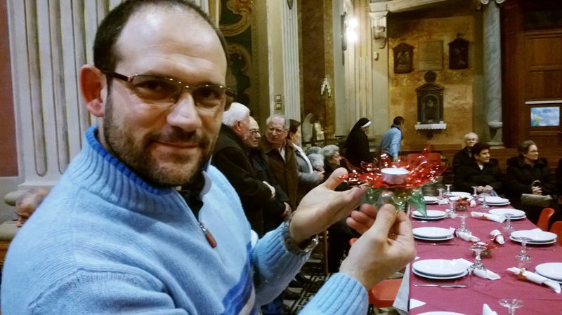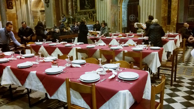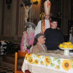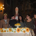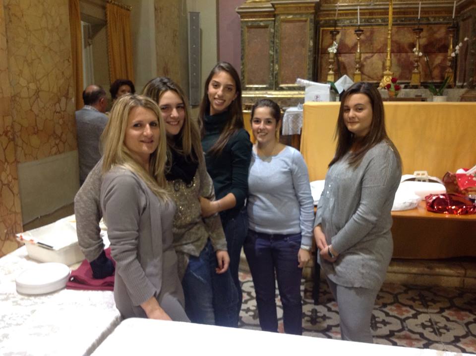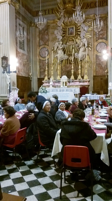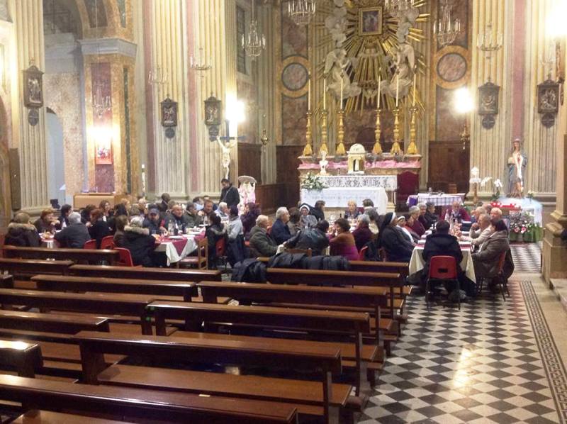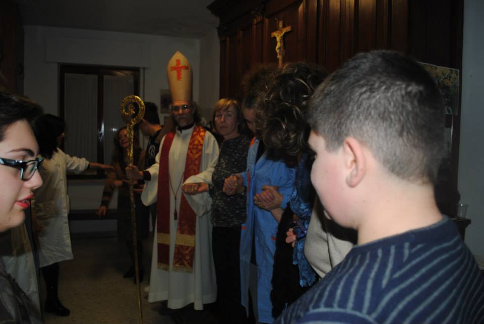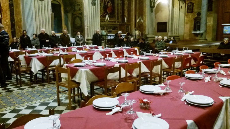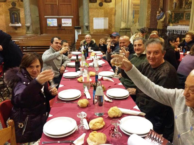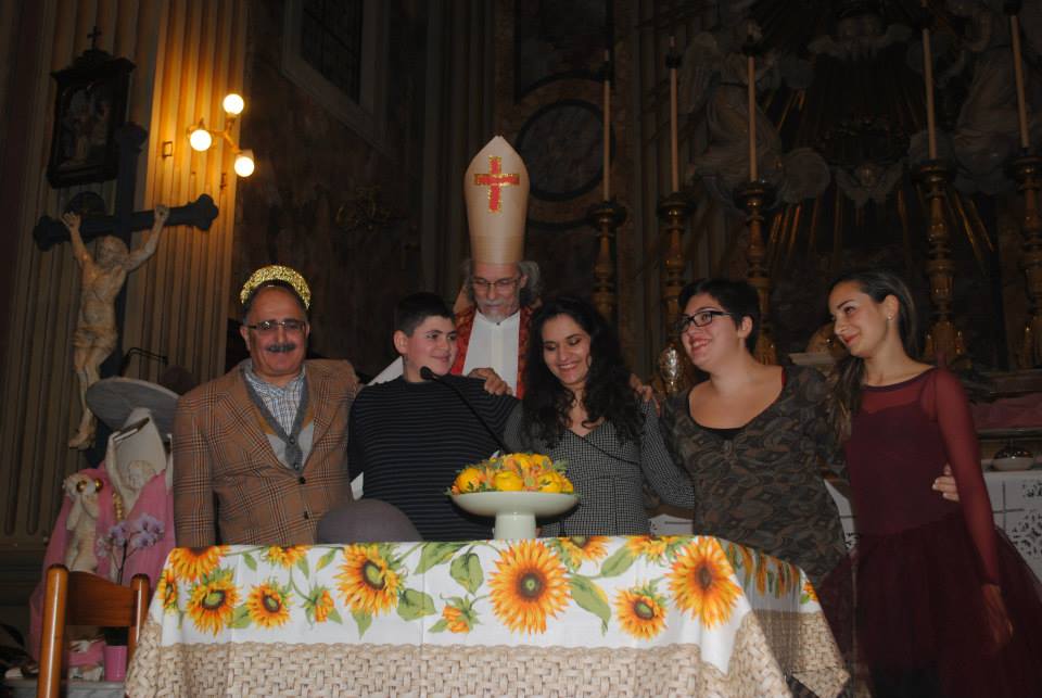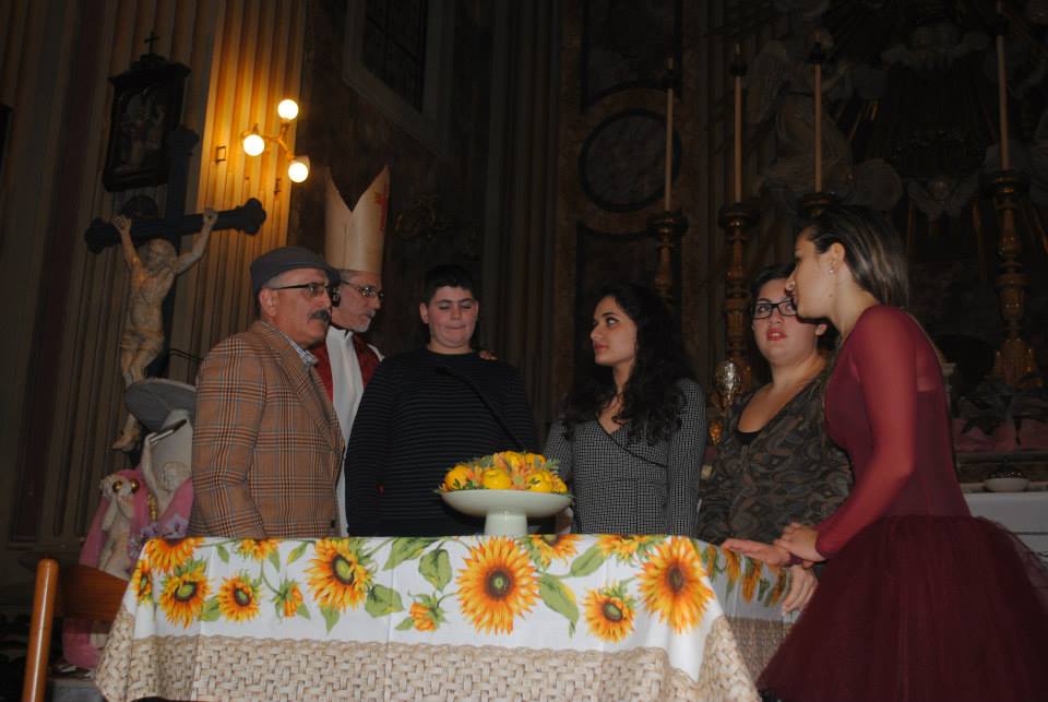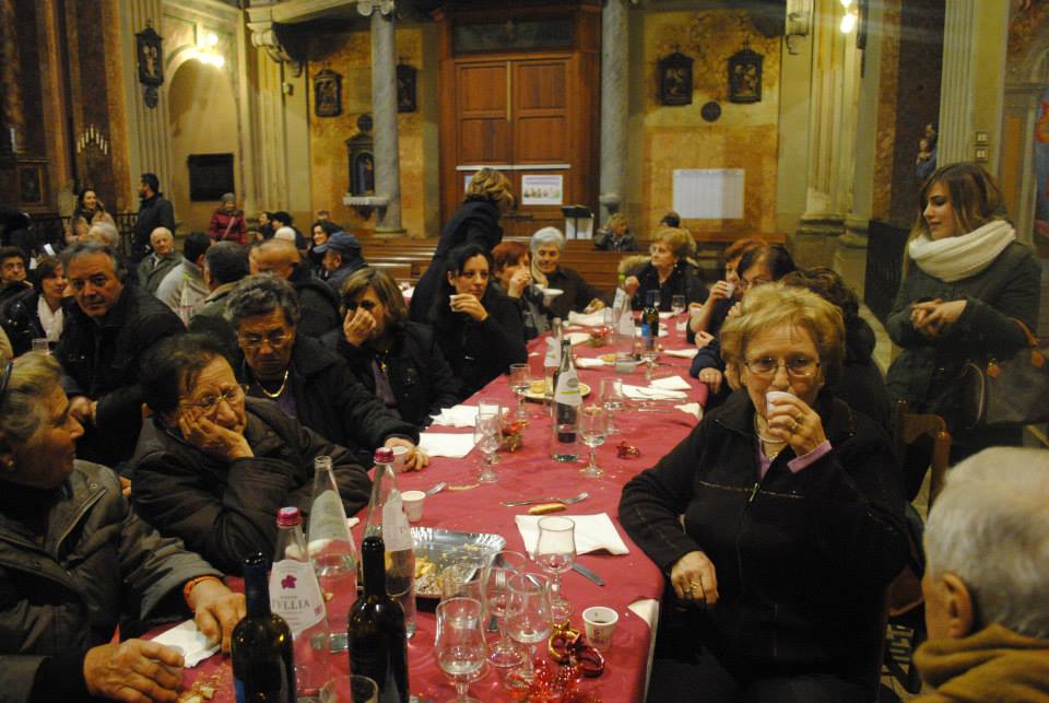Contemporaneamente al falò, nella chiesa si tenevano le prove della sorpresa che alcune persone, del gruppo educatori della parrocchia, stavano preparando per la serata del 6 dicembre. Per il giorno delle Festa del Patrono, infatti, don Alfredo ha voluto offrire una cena agli anziani in una location insolita: la chiesa parrocchiale. Alla cena, organizzata in collaborazione con Leonardo Camela del Ristorante 1941, hanno partecipato circa 60 persone; appena finita la messa per la Novena dell’Immacolata, celebrato da don Guido Coccia, alcuni volontari tra i quali gli Scout e i Giovanissimi hanno aiutato a sistemare i tavoli, ad apparecchiare e a servire agli ospiti le portate previste: dagli antipasti al secondo è stato tutto molto buono e apprezzato, mentre le educatrici hanno pensato a dei deliziosi dolci e al vino cotto. Al termine della cena ecco la sorpresa, un piccolo spettacolo su uno dei miracoli di San Niccolò, quello delle tre fanciulle: tre sorelle non hanno più la dote per sposarsi, persa dal padre al tavolo da gioco, ma San Niccolò interviene attraverso un innamorato di una delle tre ragazze per aiutarle. L’opera è stata scritta da due educatrici, Antonella e Patrizia, e messa in scena con la collaborazione di altre catechiste, Antonietta, Janet, Maria e Savina di tre ragazze che impersonavano le tre sorelle, Chiara, Giorgia e Paola, di Giovanni, che impersonava l’innamorato di una delle sorelle, Fabio, che si è occupato della musica e due adulti, Luca e Adriano, che hanno impersonato rispettivamente San Niccolò e il padre delle fanciulle.