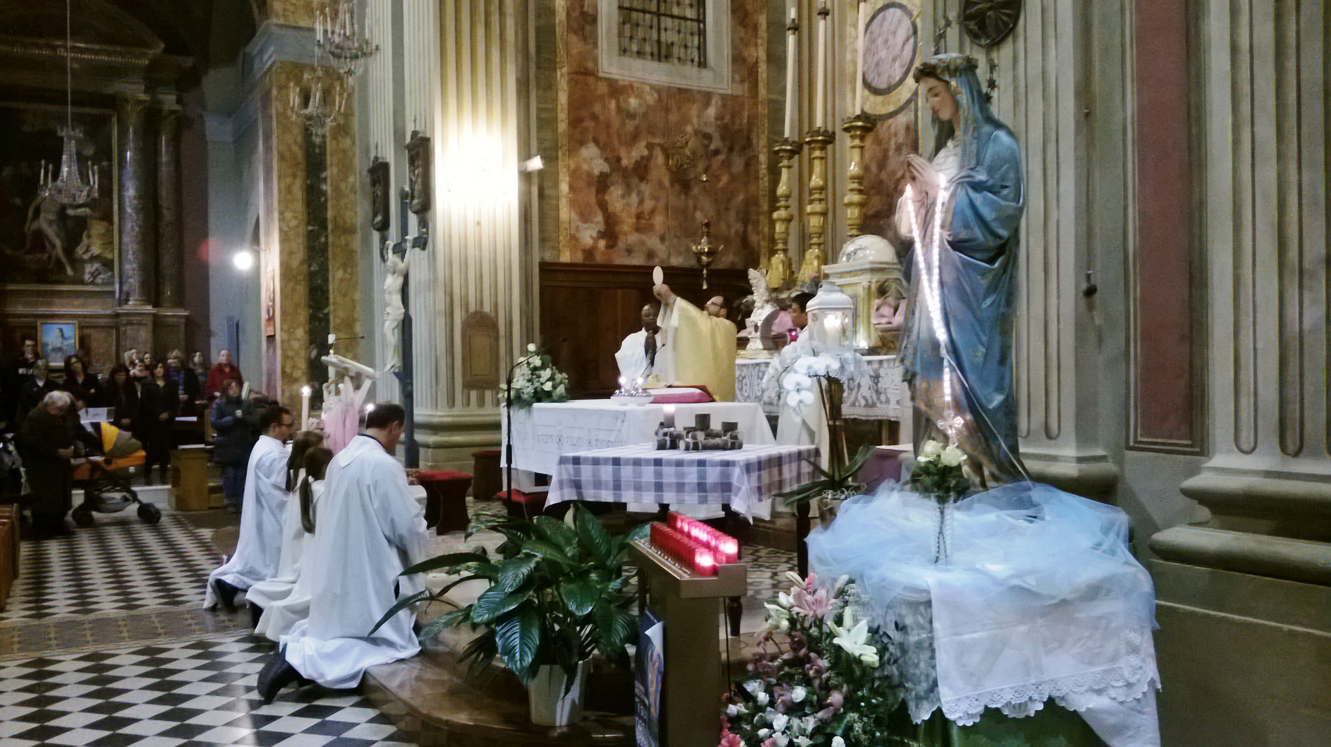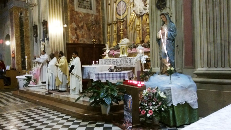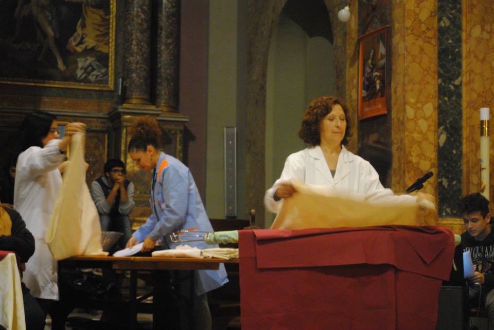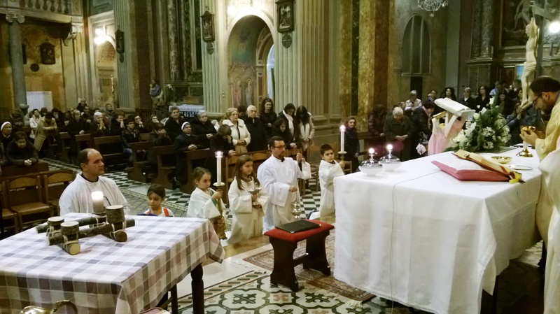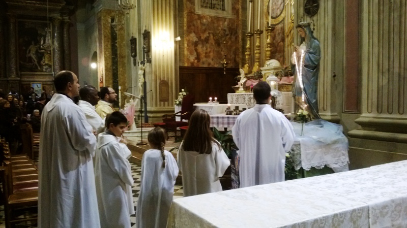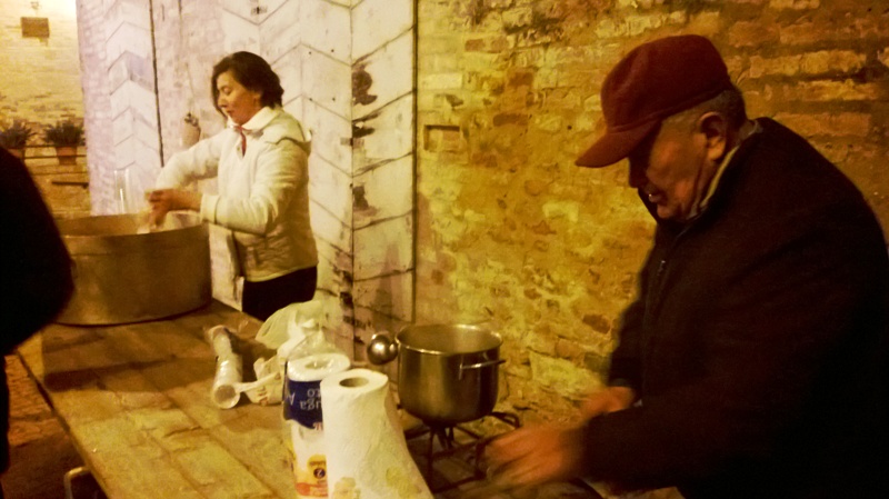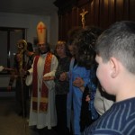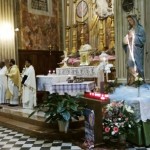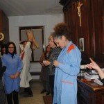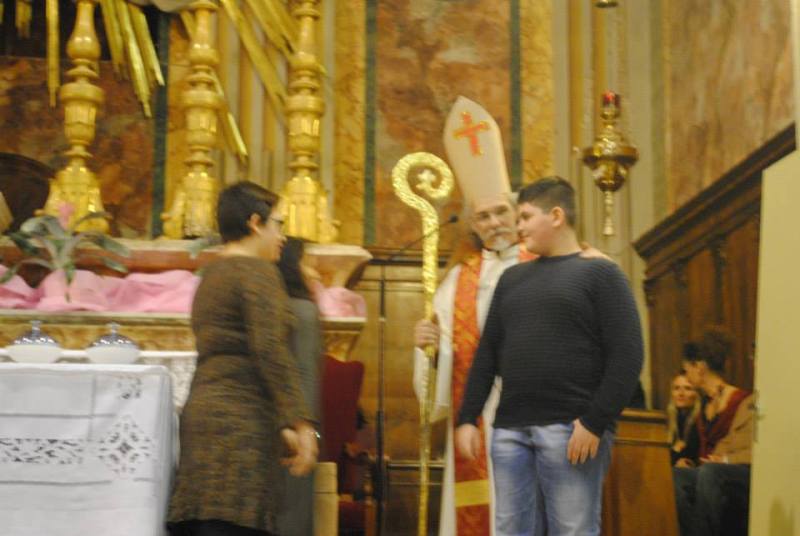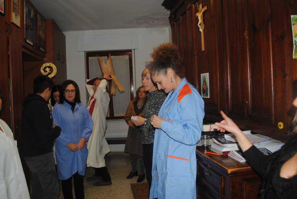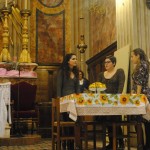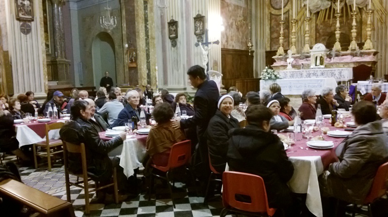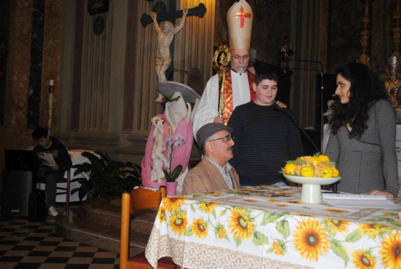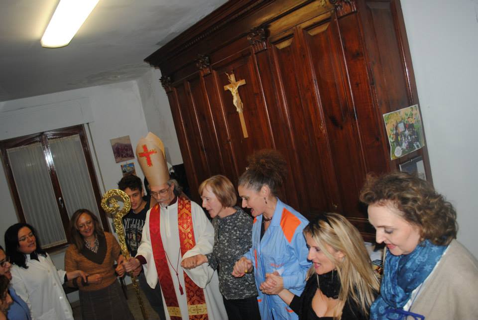 Contemporaneamente al falò, nella chiesa si tenevano le prove della sorpresa che alcune persone, del gruppo educatori della parrocchia, stavano preparando per la serata del 6 dicembre. Per il giorno delle Festa del Patrono, infatti, don Alfredo ha voluto offrire una cena agli anziani in una location insolita: la chiesa parrocchiale. Alla cena, organizzata in collaborazione con Leonardo Camela del Ristorante 1941, hanno partecipato circa 60 persone; appena finita la messa per la Novena dell’Immacolata, celebrato da don Guido Coccia, alcuni volontari tra i quali gli Scout e i Giovanissimi hanno aiutato a sistemare i tavoli, ad apparecchiare e a servire agli ospiti le portate previste: dagli antipasti al secondo è stato tutto molto buono e apprezzato, mentre le educatrici hanno pensato a dei deliziosi dolci e al vino cotto. Al termine della cena ecco la sorpresa, un piccolo spettacolo su uno dei miracoli di San Niccolò, quello delle tre fanciulle: tre sorelle non hanno più la dote per sposarsi, persa dal padre al tavolo da gioco, ma San Niccolò interviene attraverso un innamorato di una delle tre ragazze per aiutarle. L’opera è stata scritta da due educatrici, Antonella e Patrizia, e messa in scena con la collaborazione di altre catechiste, Antonietta, Janet, Maria e Savina di tre ragazze che impersonavano le tre sorelle, Chiara, Giorgia e Paola, di Giovanni, che impersonava l’innamorato di una delle sorelle, Fabio, che si è occupato della musica e due adulti, Luca e Adriano, che hanno impersonato rispettivamente San Niccolò e il padre delle fanciulle.