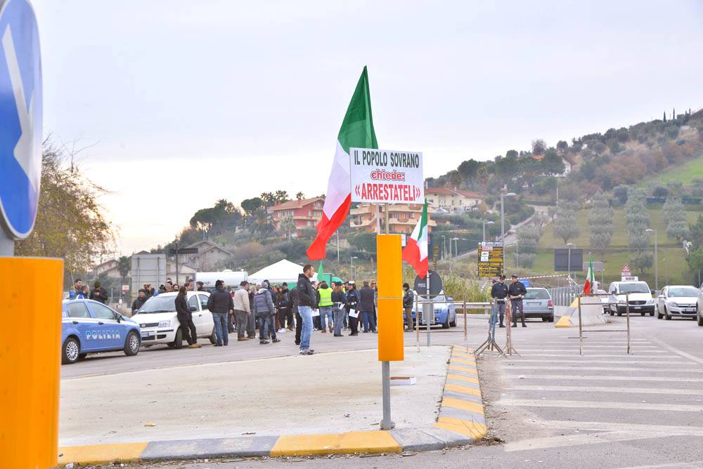 Anche San Benedetto ha il suo presidio, localizzato sul ponte del Tronto. Una cinquantina di persone, poste in prossimità del confine Marche-Abruzzo, che distribuiscono volantini e chiedono la partecipazione di tutti. Uno striscione molto eloquente è stato appeso sulla carreggiata stradale: “Avete calpestato ogni diritto e bruciato il nostro futuro, dimissioni subito”. Le proteste prendono le mosse da un comunicato molto forte che viene distribuito in ogni postazione. «Siamo il popolo dei precari, – si legge in un passaggio – dei senza futuro, di quelli che sperano in qualcosa di meglio per le generazioni future. Siamo quelli che credono nella forza delle idee, a prescindere se queste possano essere espressione di una presunta “destra” o “sinistra”; al popolo che lavora non servono etichette ma serve che i problemi, e sono tanti, siano risolti da gente onesta».