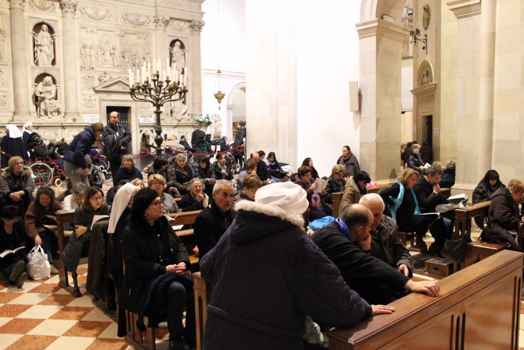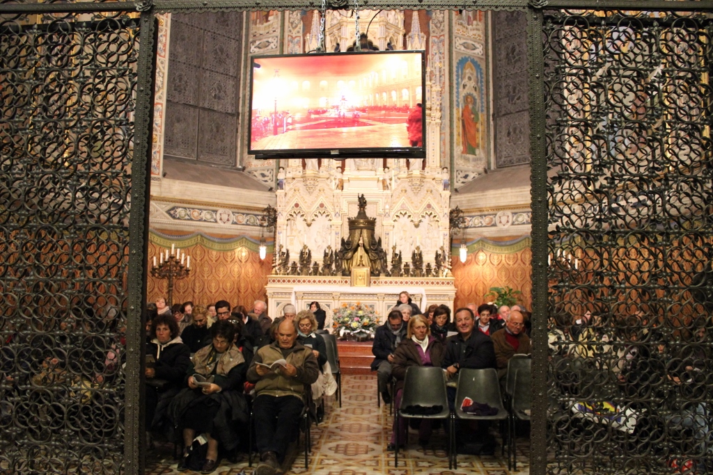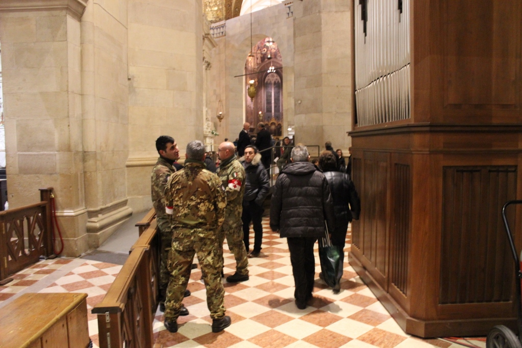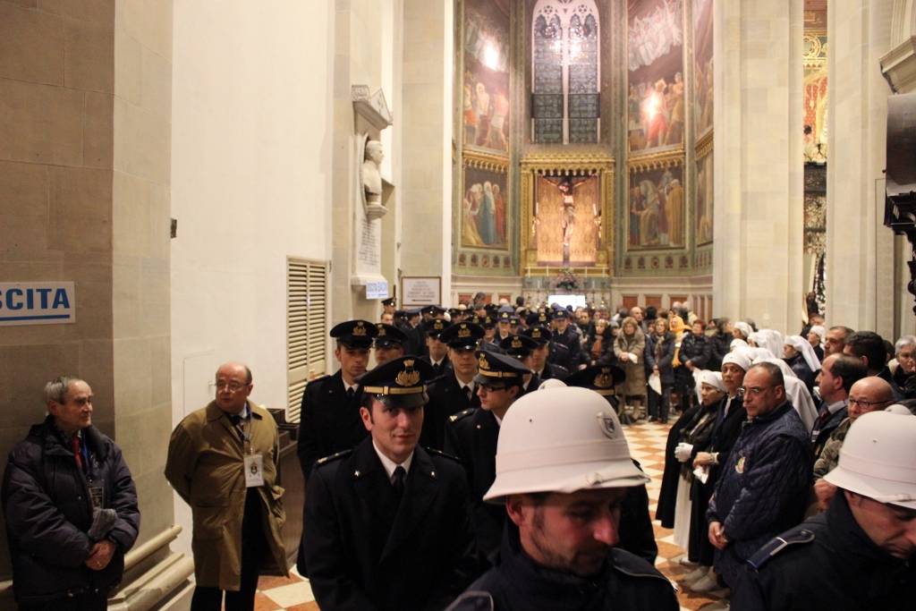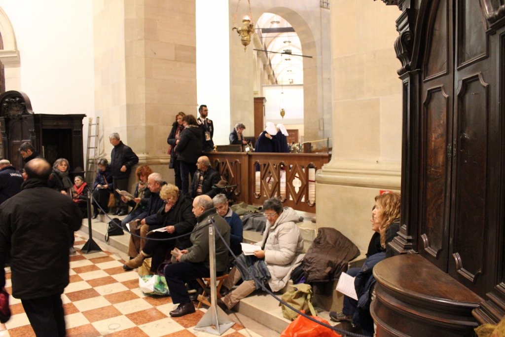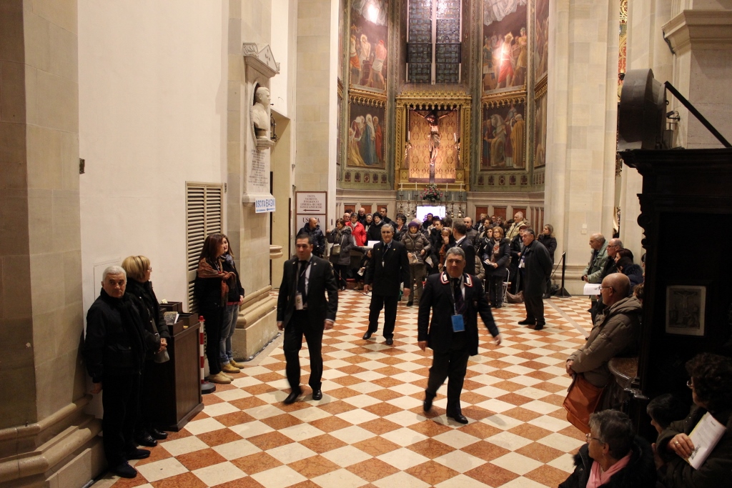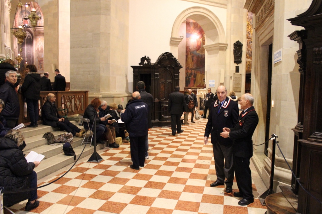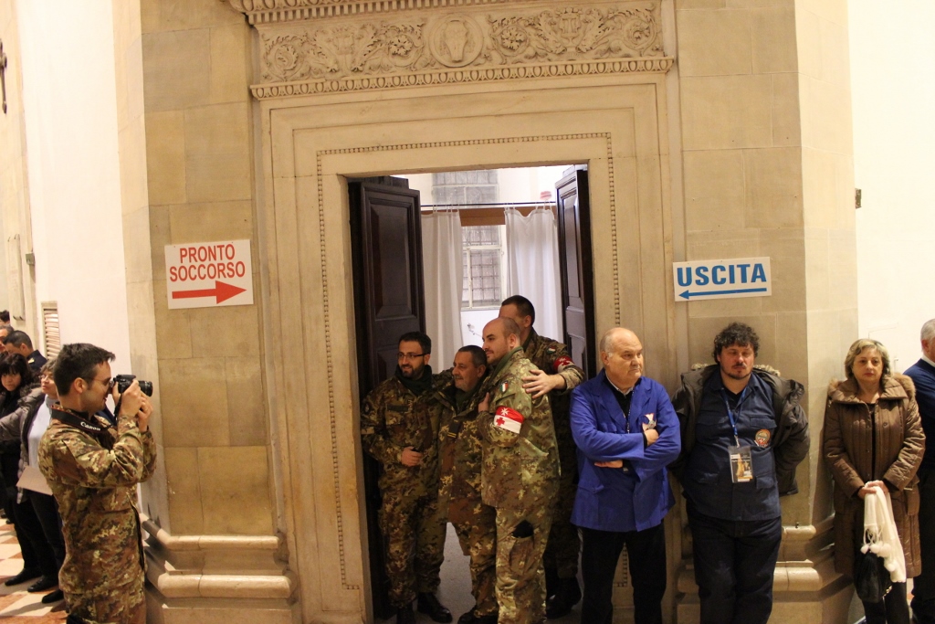 Alle ore 17.30 le porte sono state aperte e piano piano i pellegrini, sotto lo sguardo attento dei ragazzi della Protezione Civile, sono defluiti all’interno della Chiesa.