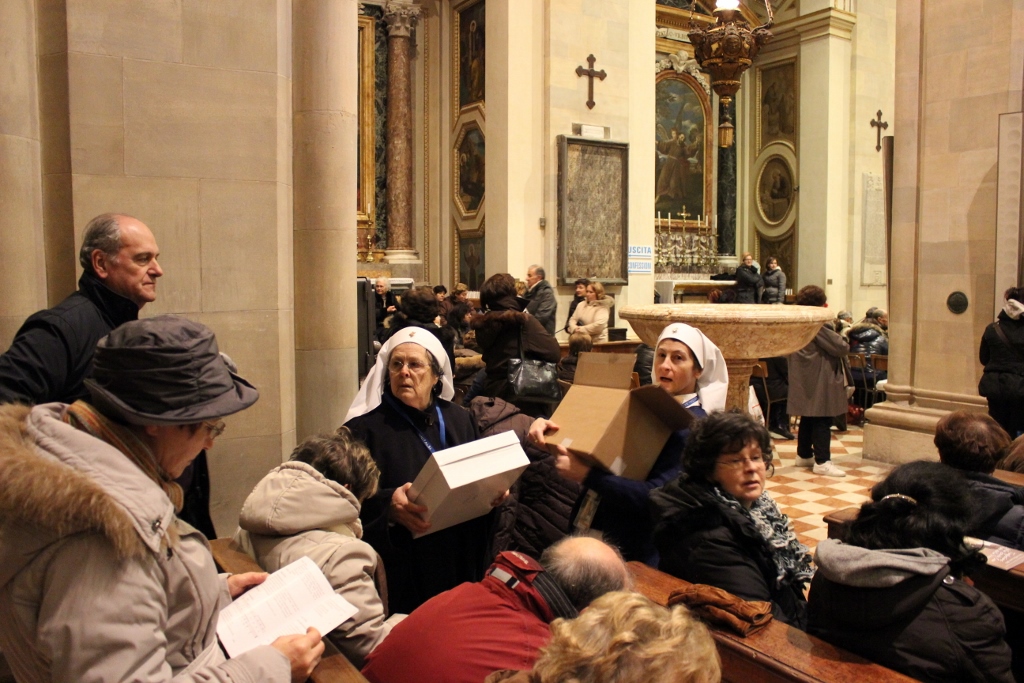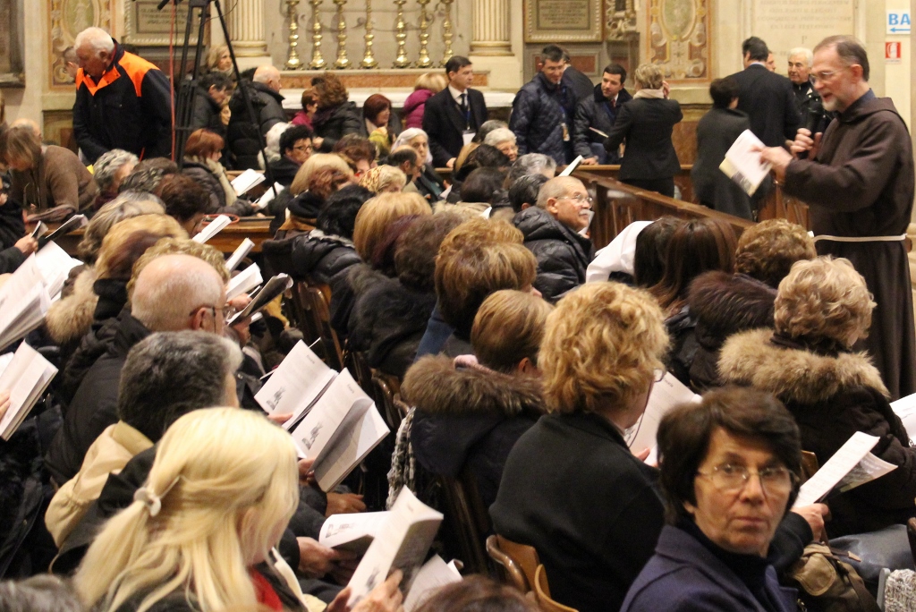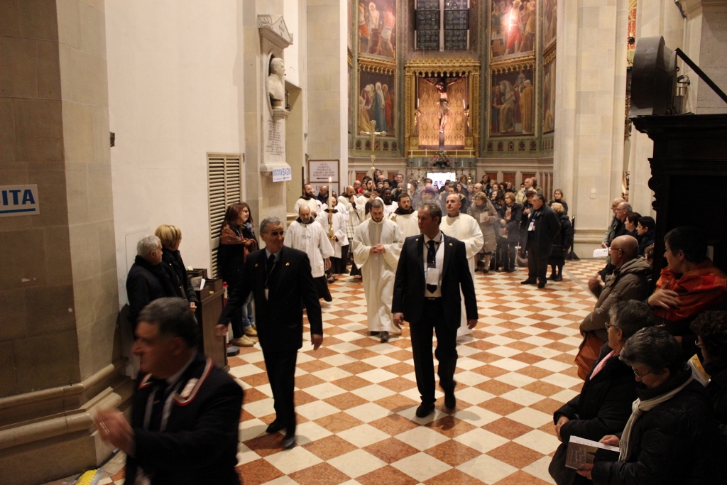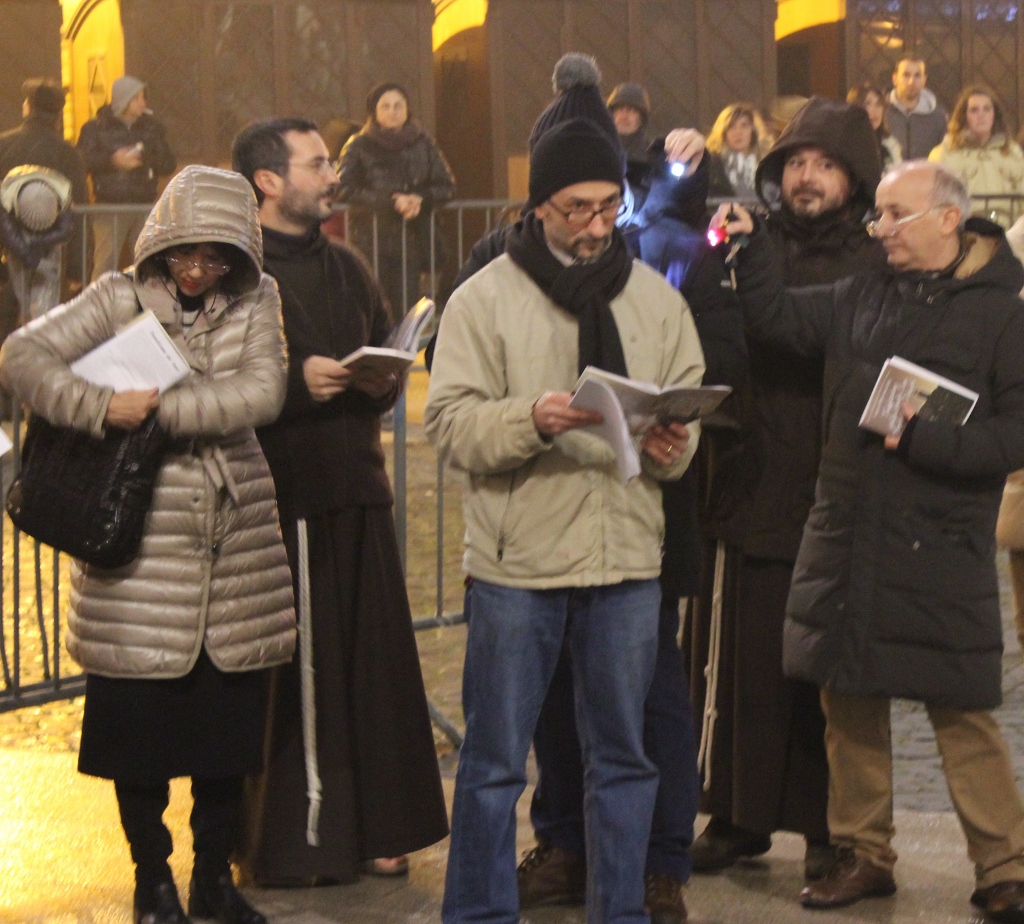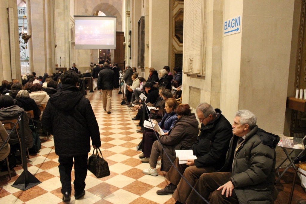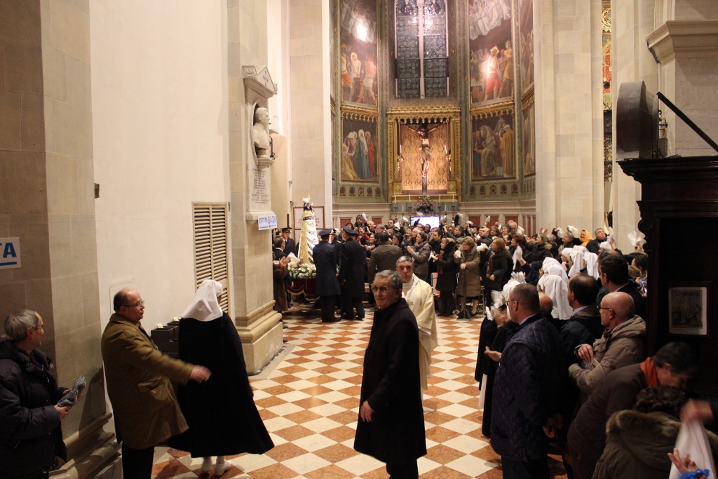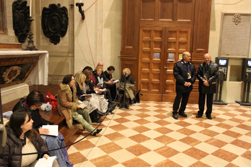 Alle ore 17.30 le porte sono state aperte e piano piano i pellegrini, sotto lo sguardo attento dei ragazzi della Protezione Civile, sono defluiti all’interno della Chiesa.