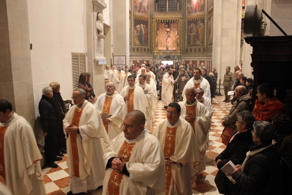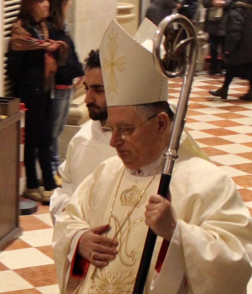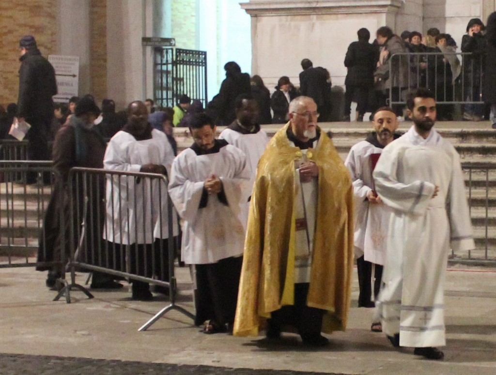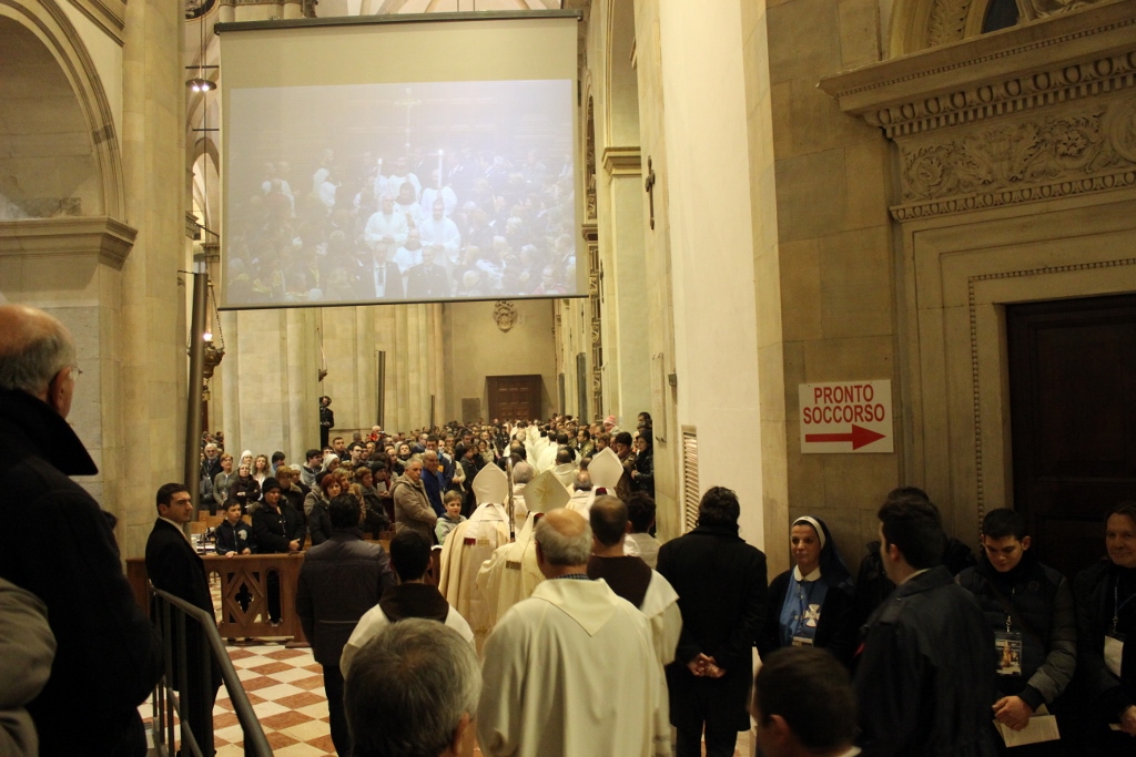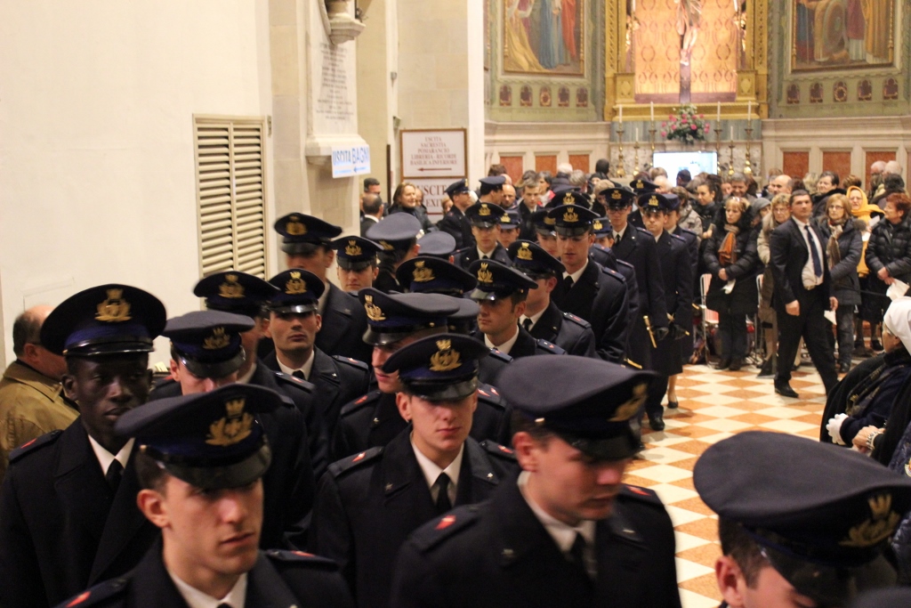 Saluto tutti voi che siete accorsi così numerosi e saluto coloro che sono rimasti fuori al freddo e che ci possono seguire attraverso gli schermi della televisione. Vorrei anche salutare i membri dell’aereonautica che hanno La Madonna di Loreto come Patrona.
