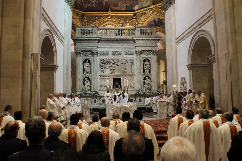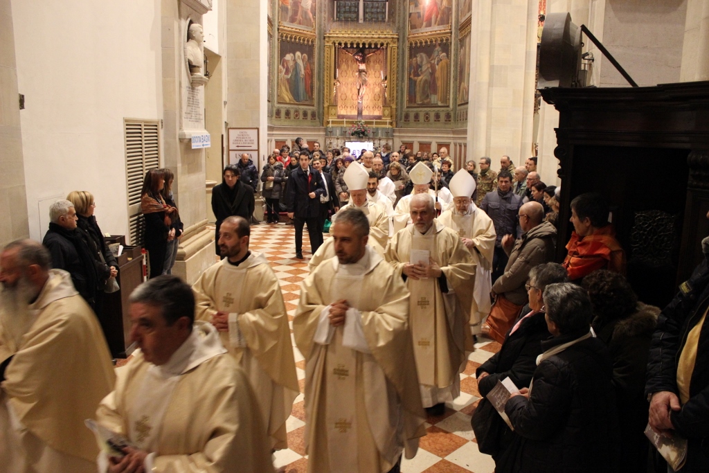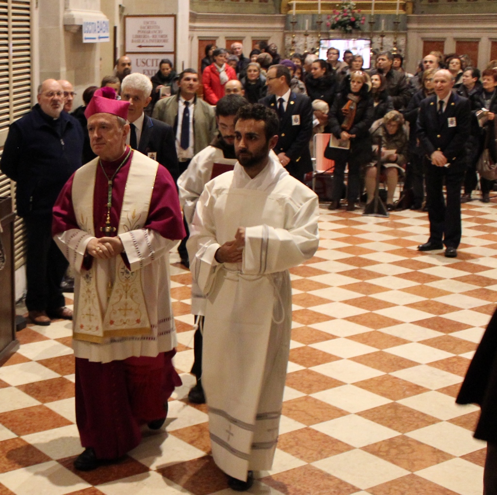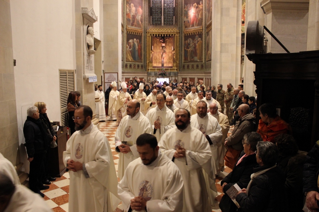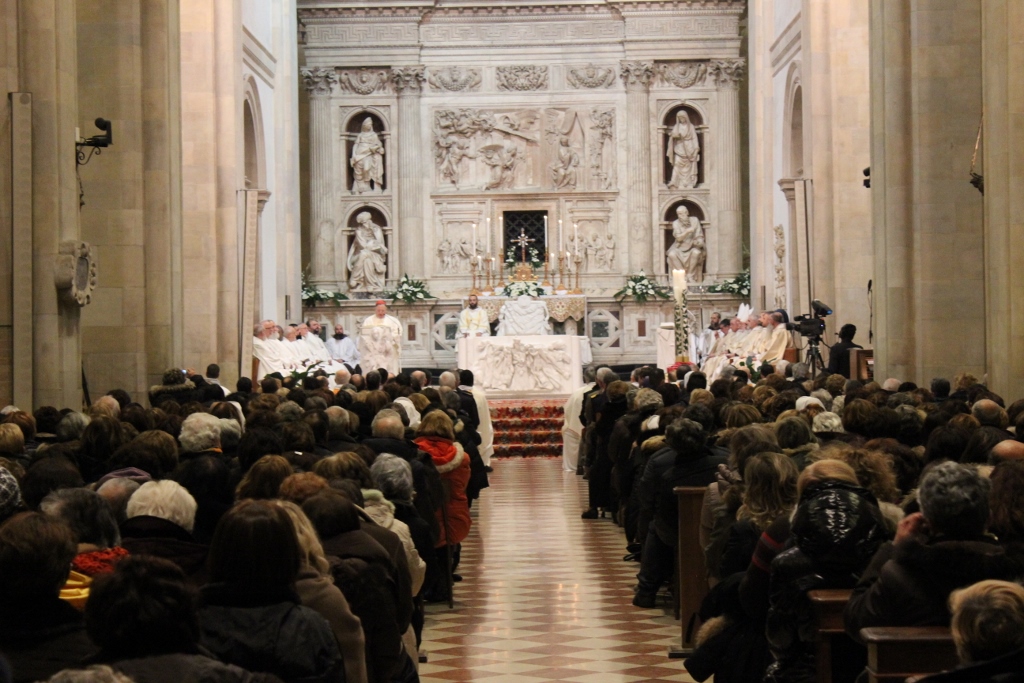 Saluto tutti voi che siete accorsi così numerosi e saluto coloro che sono rimasti fuori al freddo e che ci possono seguire attraverso gli schermi della televisione. Vorrei anche salutare i membri dell’aereonautica che hanno La Madonna di Loreto come Patrona.