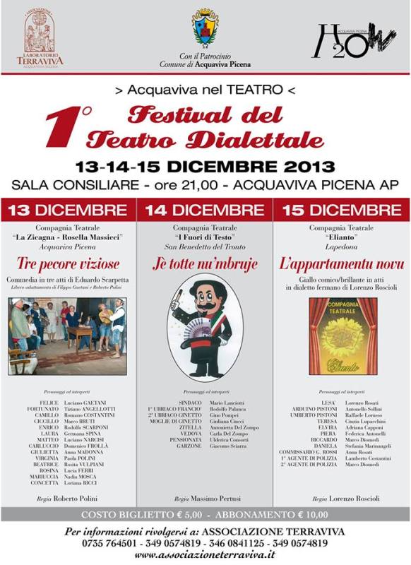 ACQUAVIVA PICENA – Questa settimana il calendario natalizio acquavivano ricco di eventi avrà come protagonista l’Associazione Laboratorio Terraviva che per gli appassionati di teatro, ma non solo, ha organizzato tre serate all’insegna del divertimento e della risata con la prima edizione del Festival del Teatro Dialettale che avrà luogo presso la Sala Consiliare in via Fontepalanca, sotto il parcheggio antistante la farmacia, nelle serate del 13-14-15 dicembre alle ore 21:00.