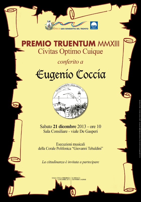 SAN BENEDETTO DEL TRONTO – Sabato 21 dicembre, alle 10, nella sala consiliare del Municipio, si terrà la cerimonia di consegna del “Premio Truentum”, la massima onorificenza concessa dal Comune di San Benedetto del Tronto a quei sambenedettesi di nascita o adozione che, operando nei vari campi dell’agire umano, siano riusciti a conseguire traguardi prestigiosi a livello nazionale e/o internazionale, dando lustro alla città.
