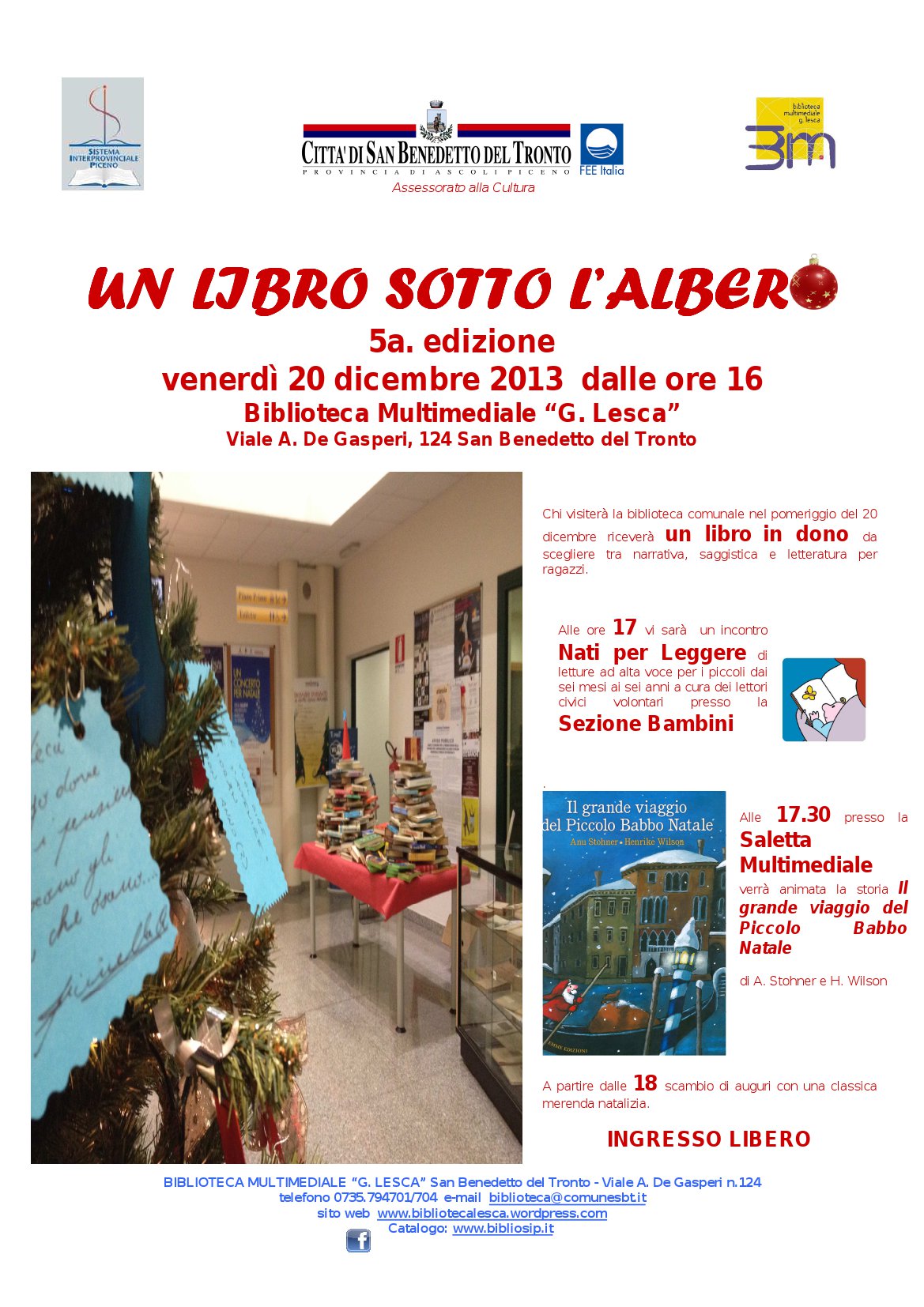 SAN BENEDETTO DEL TRONTO – Torna anche quest’anno la fortunata iniziativa “Un libro sotto l’albero”, giunta alla sua quinta edizione. Chi visiterà la biblioteca comunale “Lesca” nel pomeriggio di venerdì 20 dicembre, a partire dalle 16, riceverà un libro in dono da scegliere tra narrativa, saggistica e letteratura per ragazzi.