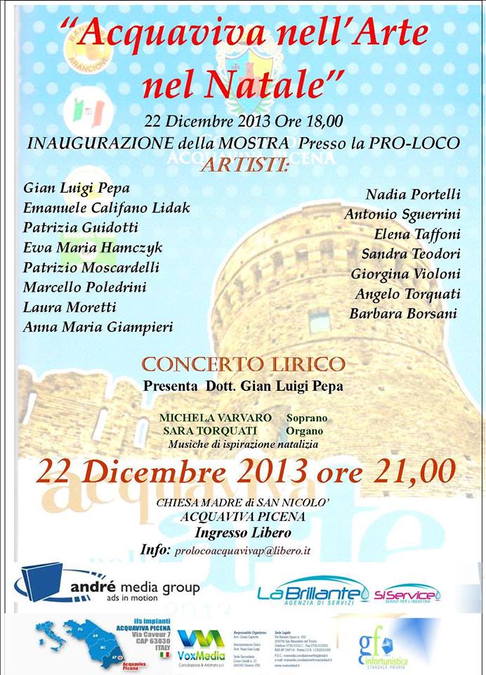 ACQUAVIVA PICENA – Domani, domenica 22 dicembre, nel cuore dell’antico borgo di Acquaviva, si terrà la manifestazione artistica “Acquaviva nell’Arte nel Natale” evento organizzato dal Dott. Gian Luigi Pepa in collaborazione con la locale Pro Loco. L’edizione natalizia di Acquaviva nell’Arte avrà inizio alle ore 18 con l’inaugurazione di una mostra di artisti vari presso la sede della ProLoco, esporranno le proprie opere: Gian Luigi Pepa, Emanuele Califano Lidak, Patrizia Guidotti, Ewa Maria Hamczyk, Patrizio Moscardelli, Marcello Poledrini, Laura Moretti, Anna Maria Giampieri, Nadia Portelli, Antonio Sguerrini, Elena Taffoni, Sandra Teodori, Giorgina Violoni, Angelo Torquati e Barbara Borsoni. La serata proseguirà con un concerto lirico nella vicina chiesa parrocchiale di San Niccolò alle ore 21; si esibiranno, in un repertorio che comprende brani di W. A. Mozart, G. Carcani, G. B.Pergolesi, A. Adam, S. Torquati, M. Reger, G. Verdi, la giovane soprano Michela Varvaro e la pianista e compositrice Sara Torquati, con la lettura di brani dedicati al natale a cura di Gian Luigi Pepa.