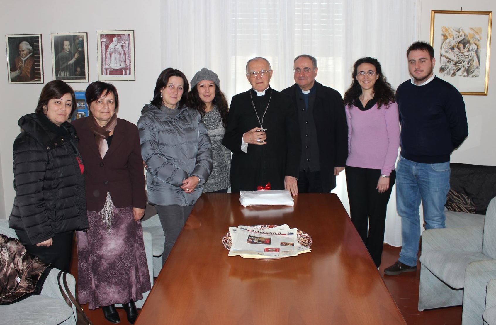 DIOCESI – Una rappresentanza del consiglio dell’Azione Cattolica diocesana con l’assistente unitario don Luigino Scarponi e la presidente Monica Vallorani, a nome di tutta l’associazione ha incontrato il vescovo Gervasio per i consueti auguri di Buon Natale. L’incontro è stato l’occasione anche per esprimere il ringraziamento e il saluto di tutta l’Ac verso il proprio Pastore che ha svolto il suo ministero nella nostra diocesi in questi anni. Un momento di fraterno scambio di auguri che il vescovo ha rivolto all’associazione, attraverso i responsabili presenti, ai loro familiari, ricordando con la sollecitazione di papa Francesco, di vivere la tenerezza in questo Natale.