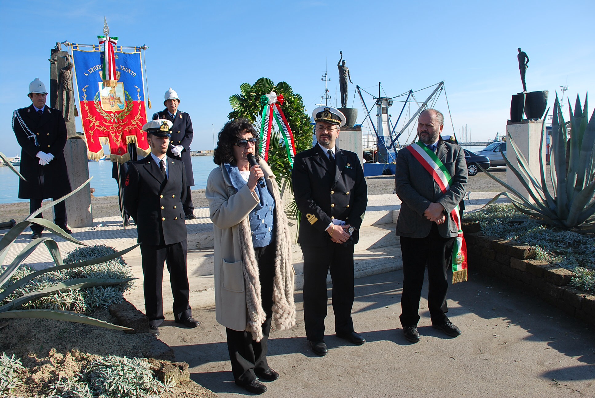 Dopo la deposizione di una corona di fiori dinanzi al monumento “Il mare, il ritorno” di Paolo Annibali, il corteo si è spostato verso il molo nord dove è stata deposta una seconda corona sulle lapidi che ricordano i nomi dei morti nelle tante tragedie del mare che la città nei decenni ha dovuto vivere.