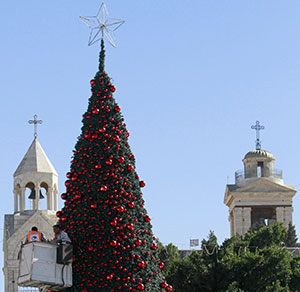 Dal 1° dicembre svetta luminoso in piena piazza della Natività, antistante l’omonima basilica, nel centro di Betlemme. Dall’alto dei suoi 15 metri di altezza, decorato con 12mila luci e 4.000 palle, l’albero natalizio della città invita tutti, abitanti, turisti e pellegrini, a fare festa. Ogni anno, a Natale, Betlemme diventa capitale elettiva della fede cristiana e si dispone, per questo, ad accogliere decine di migliaia di pellegrini da tutto il mondo. Gli hotel e gli alberghi sono praticamente tutti esauriti. Nonostante il muro israeliano che la circonda, separandola da Gerusalemme, e che la rende una prigione a cielo aperto, l’accoglienza e l’ospitalità della città è grande. In fondo, dicono i betlemiti, “non abbiamo accolto la Sacra Famiglia duemila anni fa, da allora cerchiamo di recuperare!”.