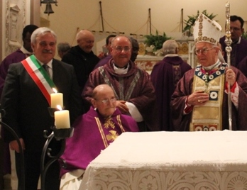 Don Gerardo con il Vescovo Mons. Gervasio Gestori, Don Luigino Scarponi ed il Sindaco di Cupra Domenico D’Annibali