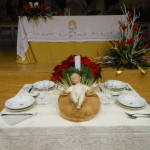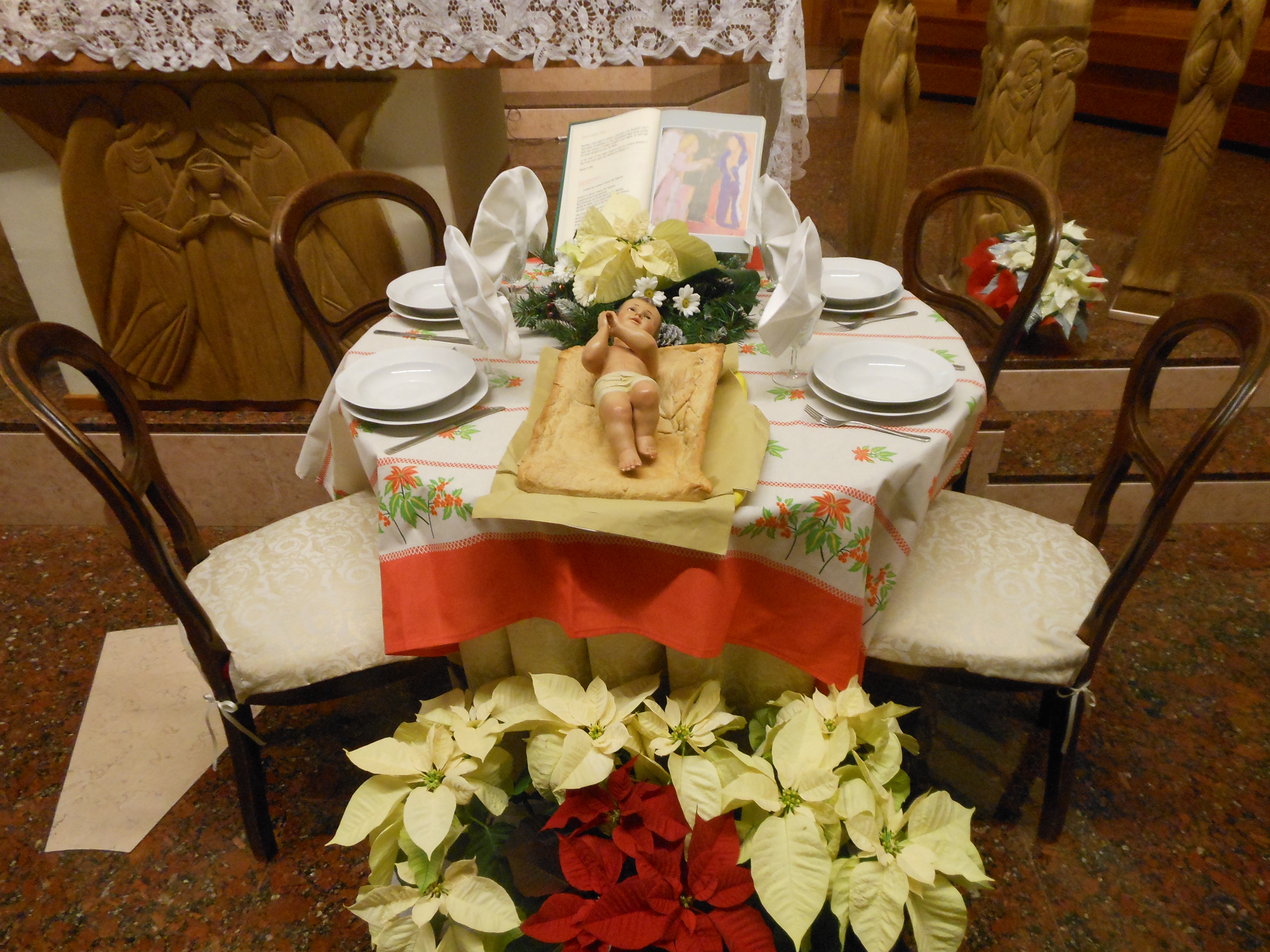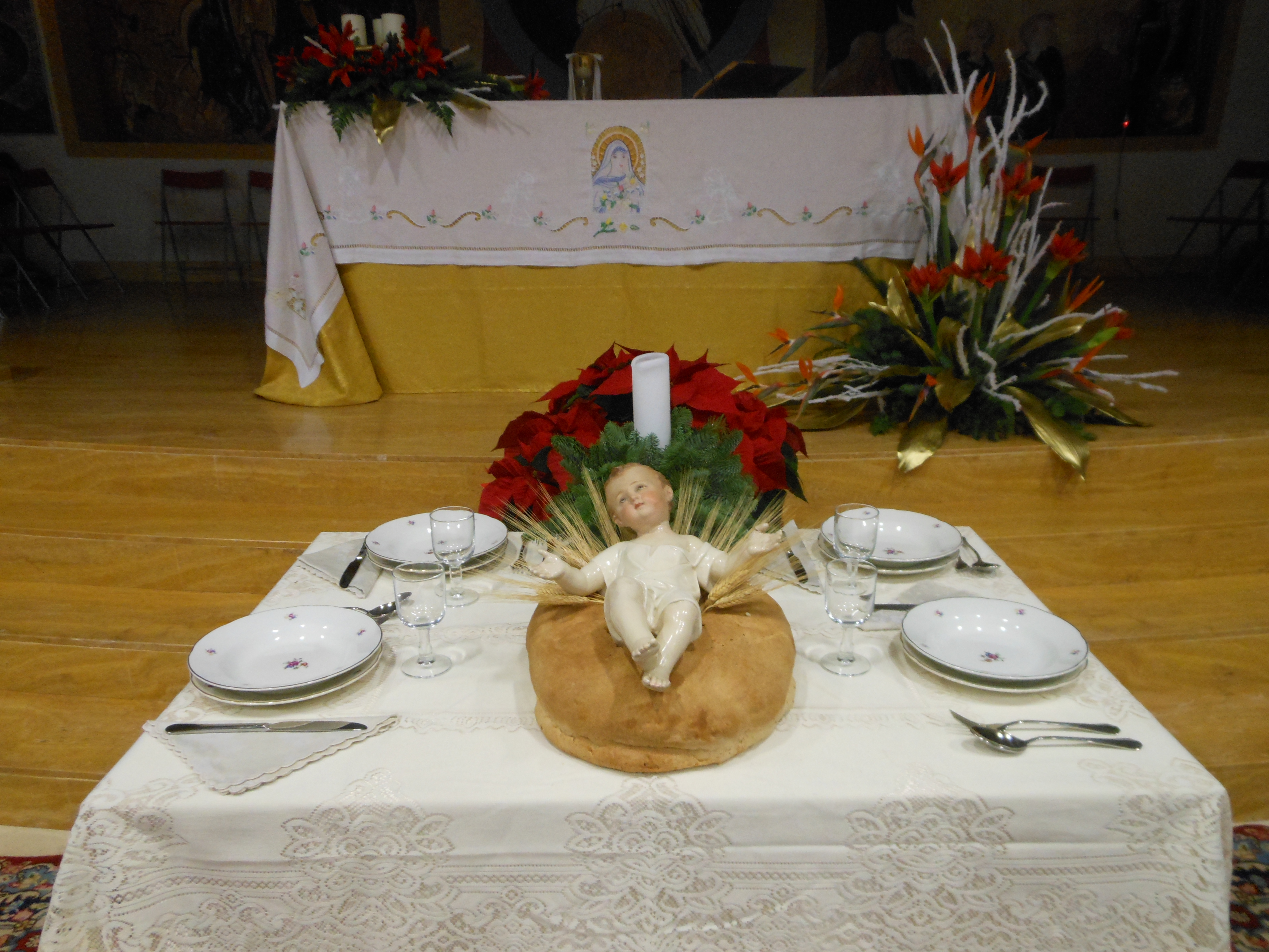 Di domenica in domenica, sono stati apparecchiati con la corona d’Avvento, segno della luce della fede che ci permette di andare incontro al Signore che viene. Poi il libro della Parola a ricordare il desiderio di Dio di comunicare con l’uomo. Ad abbellire la tavola i fiori della festa, espressione della gioia per la venuta di Gesù. Sono state aggiunte le sedie per fare spazio all’accoglienza e invitare alle diverse iniziative del tempo di avvento. Infine è stato posto al centro della tavola il pane della fraternità, a dire l’attenzione all’altro in cui ama nascondersi il Figlio di Dio, e nel pane è stato messo il Bambinello! Il messaggio per ogni persona e comunità è quello di mettere nelle nostre tavole la presenza di Gesù attraverso chi viene, chi bussa, chi chiede perchè povero di pane e di affetto.