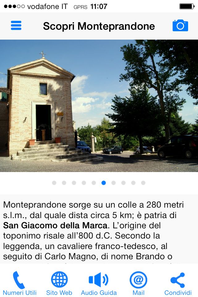 UN “ASSISTENTE VIRTUALE” L’Applicazione “My Monteprandone”, una volta scaricata sul proprio dispositivo, consente di consultare un’ampia serie di testi, immagini, audioguide, video, sia in italiano che in inglese. Questi contenuti presentano i beni artistici e culturali, illustrano gli itinerari turistici e forniscono indicazioni sui mezzi di trasporto, danno visibilità ad eventi e manifestazioni locali, sono una importante vetrina per hotel, ristoranti, cantine, produttori di tipicità.